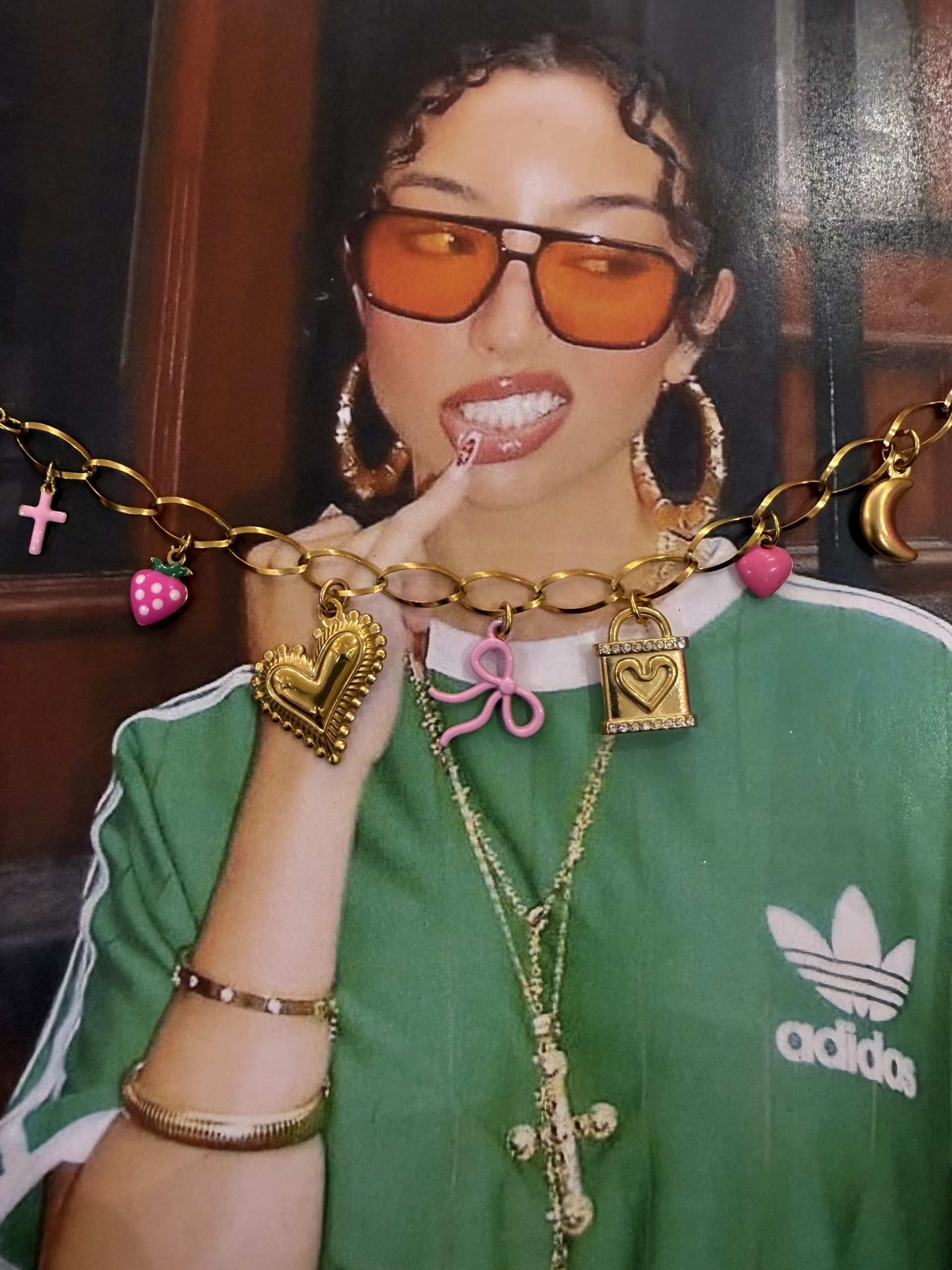 Κομψό βραχιόλι από ανοξείδωτο ατσάλι σε χρυσή απόχρωση, διακοσμημένο σε όλο του το μήκος με charms. Ένα ρομαντικό και ταυτόχρονα μοντέρνο κόσμημα . Ιδανικό για να φορεθεί μόνο του ή σε layering με άλλα βραχιόλια, προσθέτοντας μια ξεχωριστή πινελιά σε κάθε look.