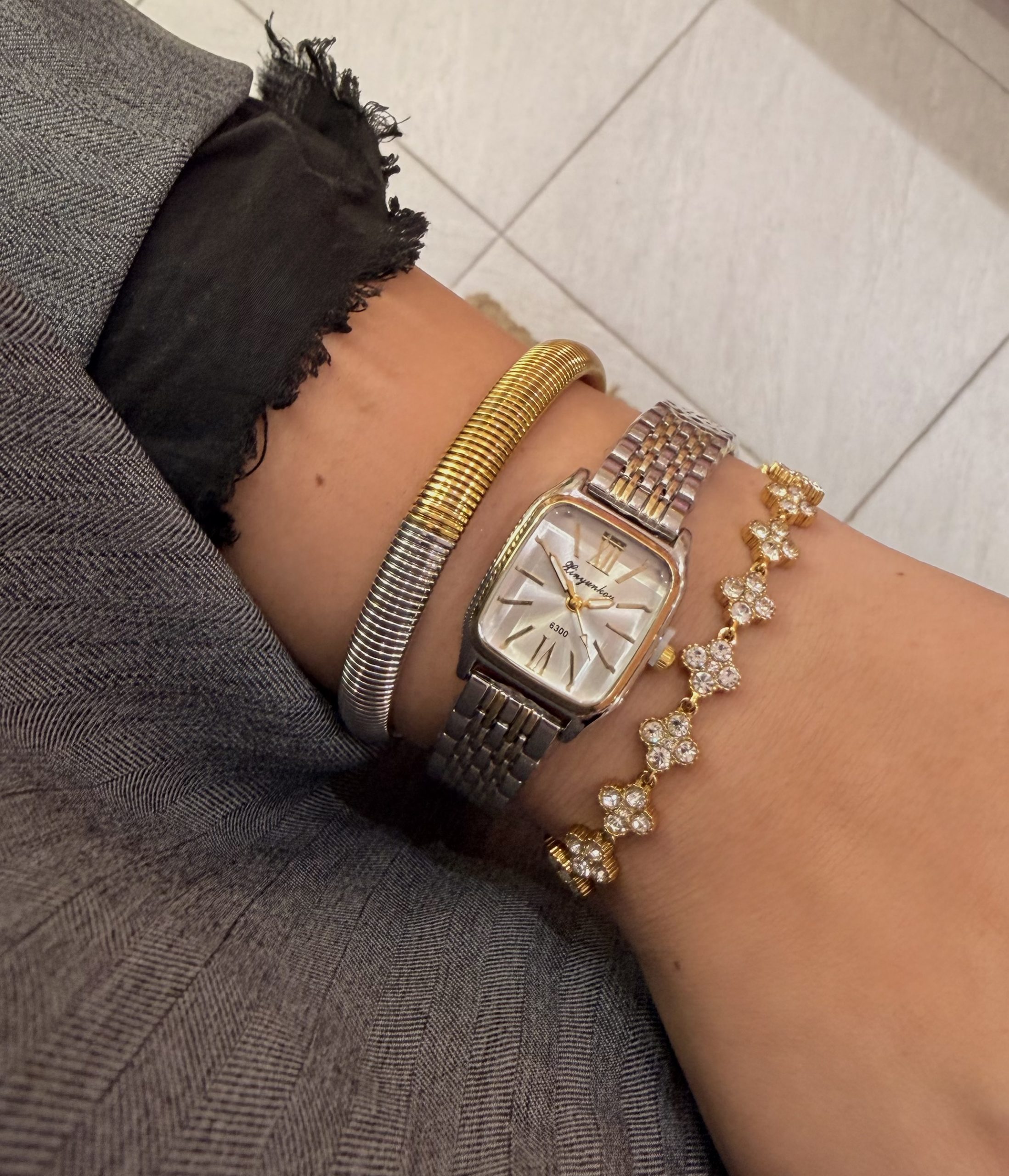 Εντυπωσιακό ρολόι που συνδυάζει τη διαχρονική κομψότητα με τη σύγχρονη λάμψη. Το λευκό καντράν αναδεικνύεται μεζι με πολυτελείς χρυσές λεπτομέρειες προσθέτοντας μία αίσθηση πολυτέλειας σε κάθε εμφάνιση. Το δίχρωμο λουράκι σε χρυσό και ασημί τόνο ολοκληρώνει αρμονικά το σχέδιο, καθιστώντας το ιδανικό τόσο για καθημερινή χρήση όσο και για πιο επίσημες περιστάσεις.