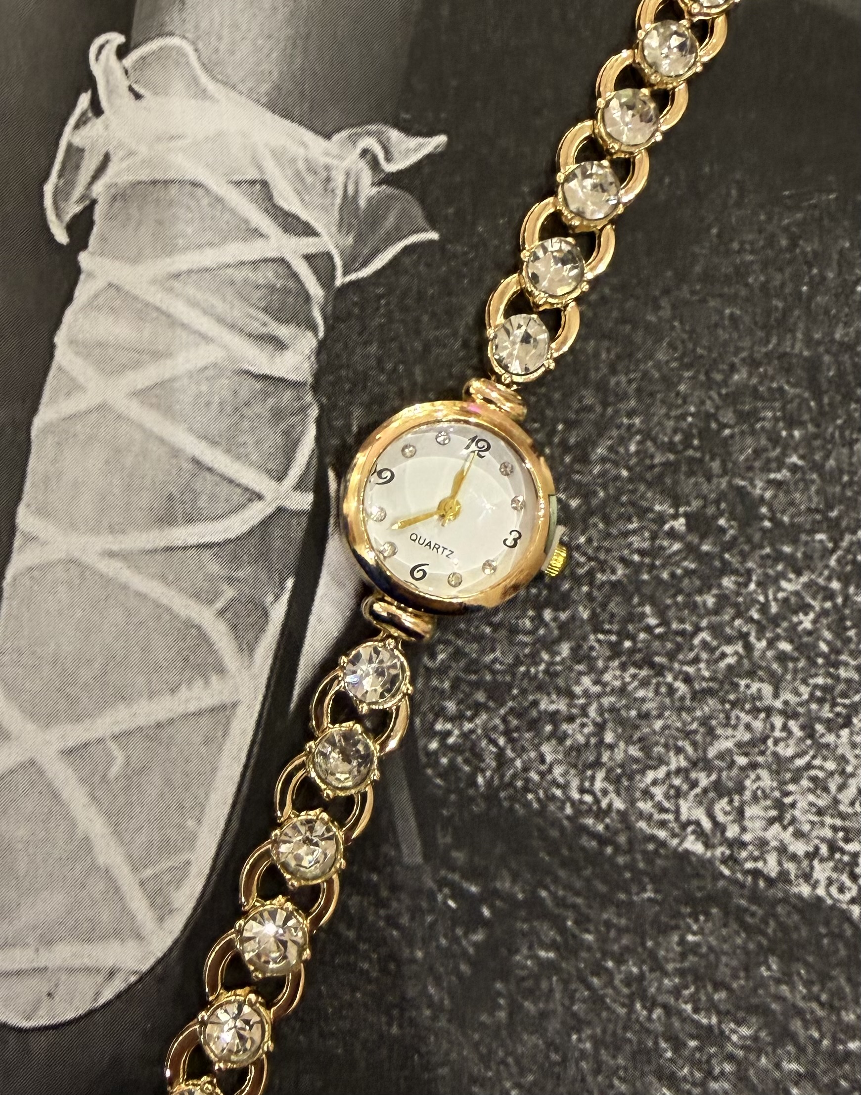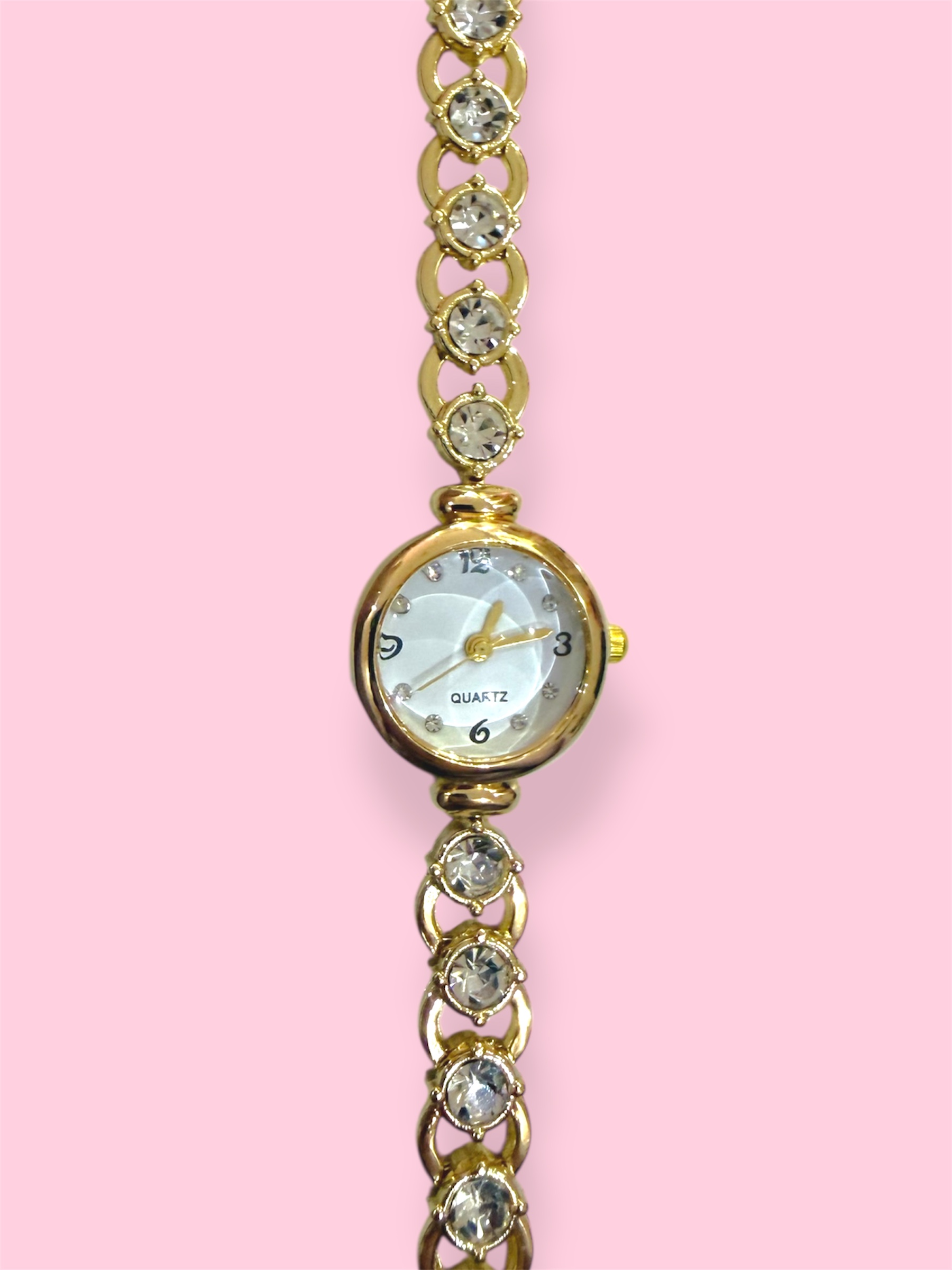 Ένα ρολόι σε κομψό vintage στυλ που αποπνέει ρομαντισμό και διαχρονική λάμψη. Το λουράκι του είναι διακοσμημένο με λευκά στρας σε όλο το μήκος, προσθέτοντας μια εκλεπτυσμένη, φωτεινή λεπτομέρεια. Η απαλή χρυσή, γυαλιστερή απόχρωση του μεταλλικού μέρους συνδυάζεται αρμονικά δημιουργώντας ένα elegant κομμάτι που ξεχωρίζει σε κάθε εμφάνιση. Ιδανικό για όσες αγαπούν το vintage glam και θέλουν ένα ρολόι που λειτουργεί και ως κόσμημα