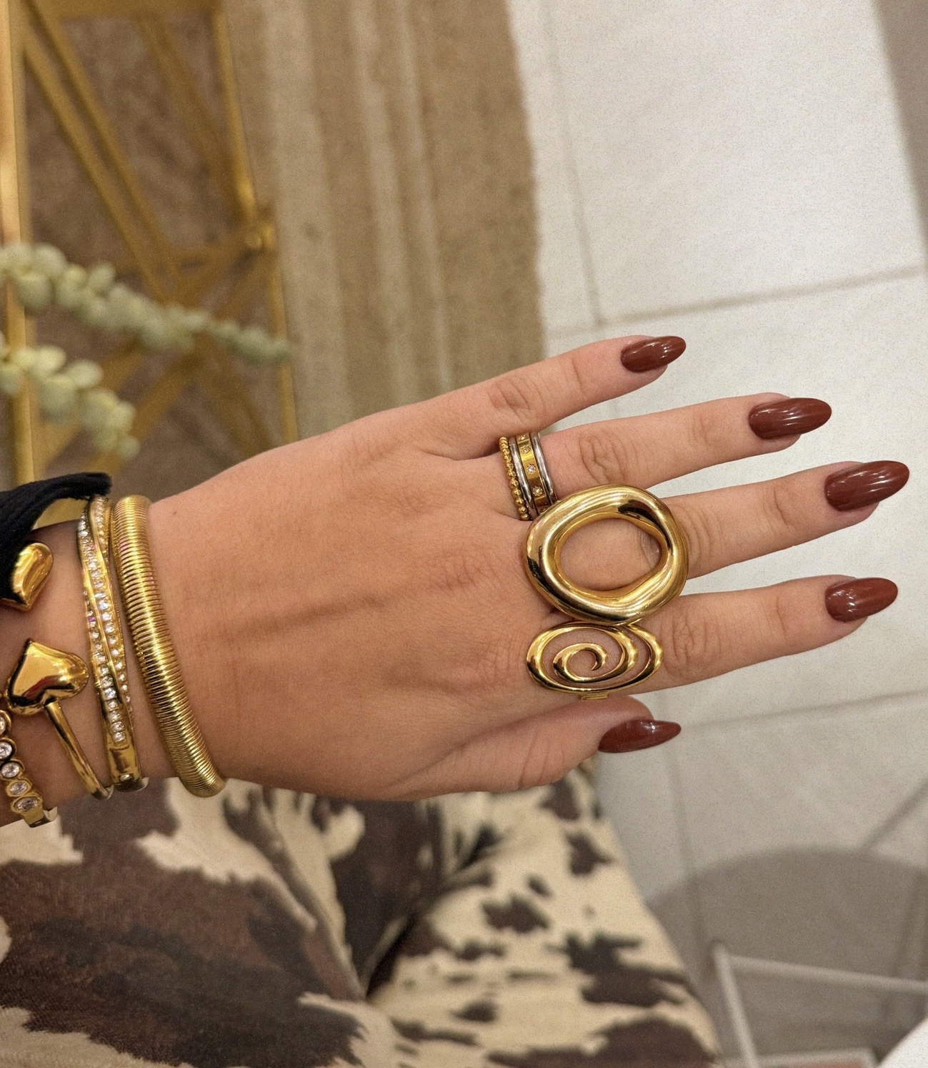 Κράμα χαλκού και ψευδαργύρου, με χρυσή όψη και εξαιρετική αντοχή. Είναι ιδανικό για statement κοσμήματα. Μπορεί να οξειδώνεται με τον καιρό, κάτι που μπορεί να προληφθεί με σωστή φροντίδα και αποθήκευση.