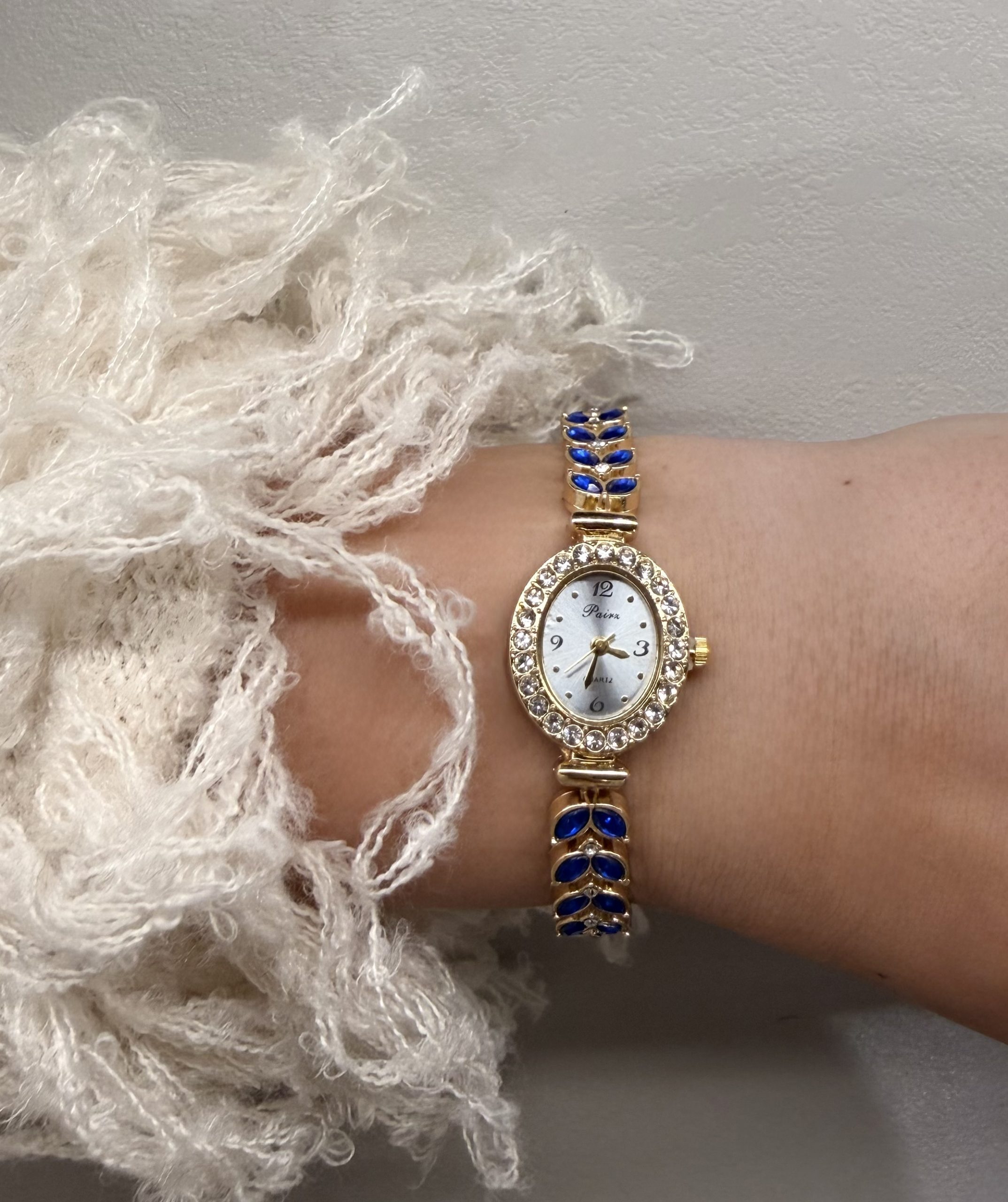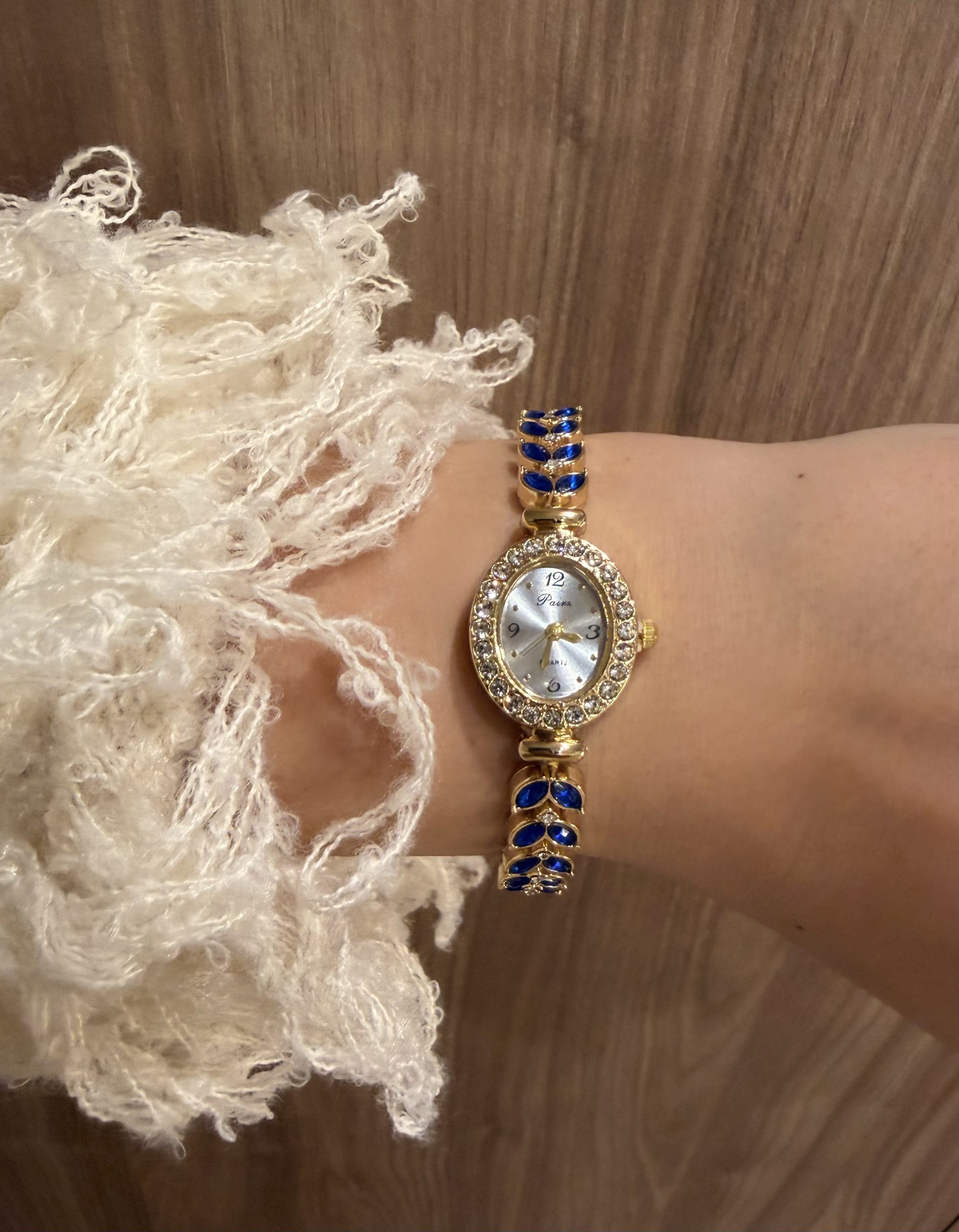 Με μπλε κρυσταλλάκια που μοιάζουν σαν μικρά φιλαράκια να αγκαλιάζουν τον καρπό, αυτό το ρολόι ξεχωρίζει για την κομψότητα και τη λεπτομέρειά του. Το πολύ μικρό καντράν το καθιστά ιδανικό για λεπτούς καρπούς, ενώ το design του προσφέρει έναν μοναδικό χαρακτήρα.