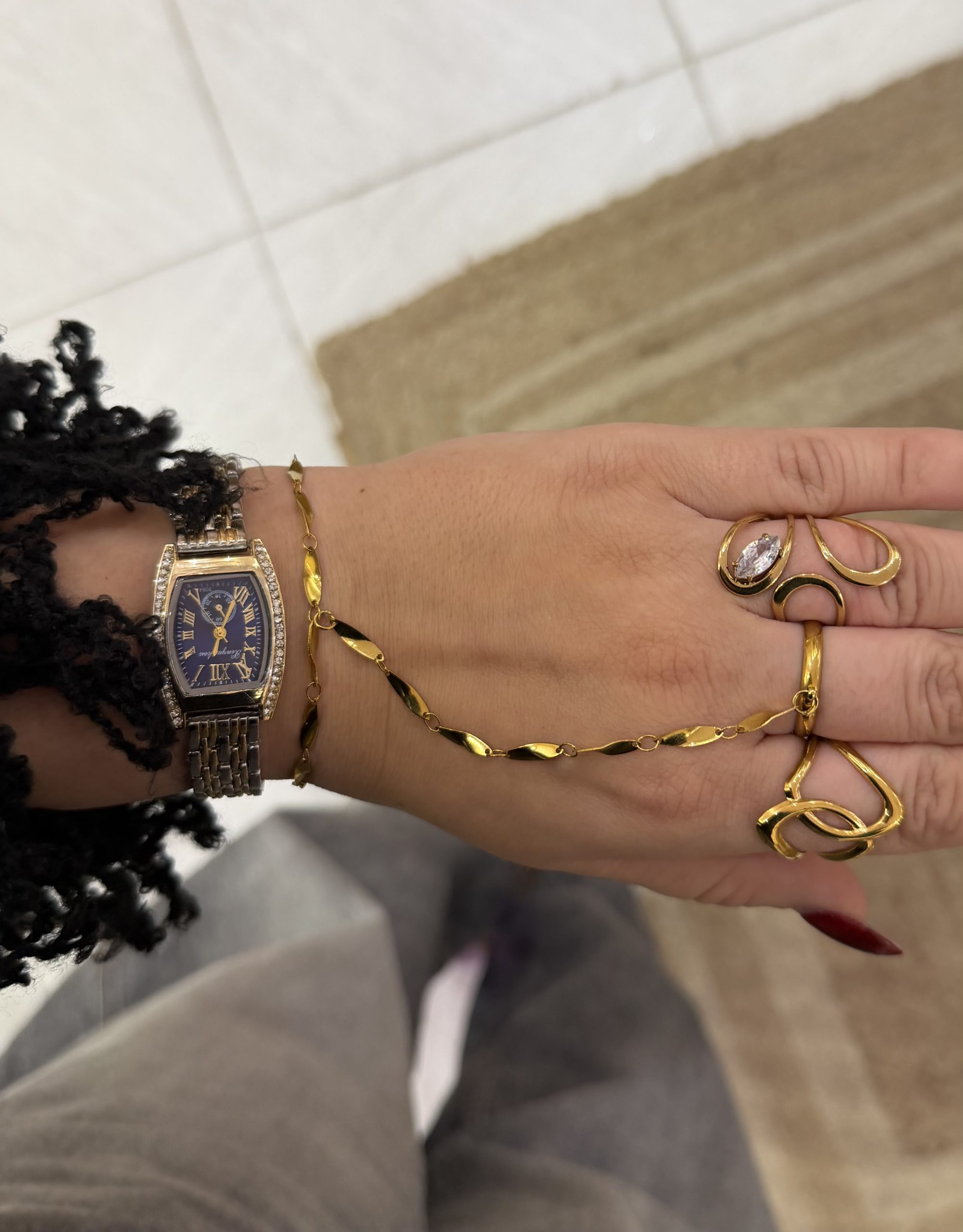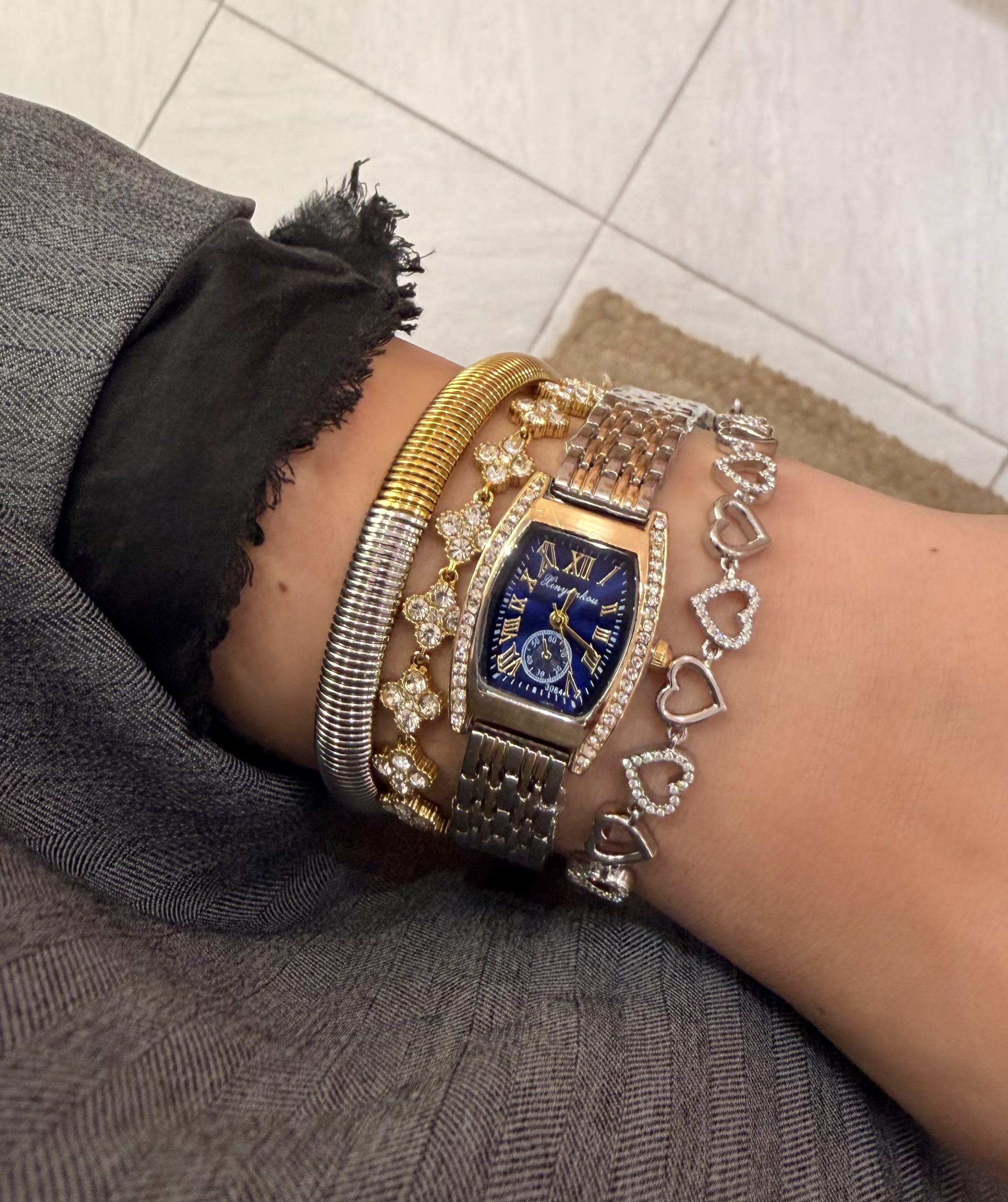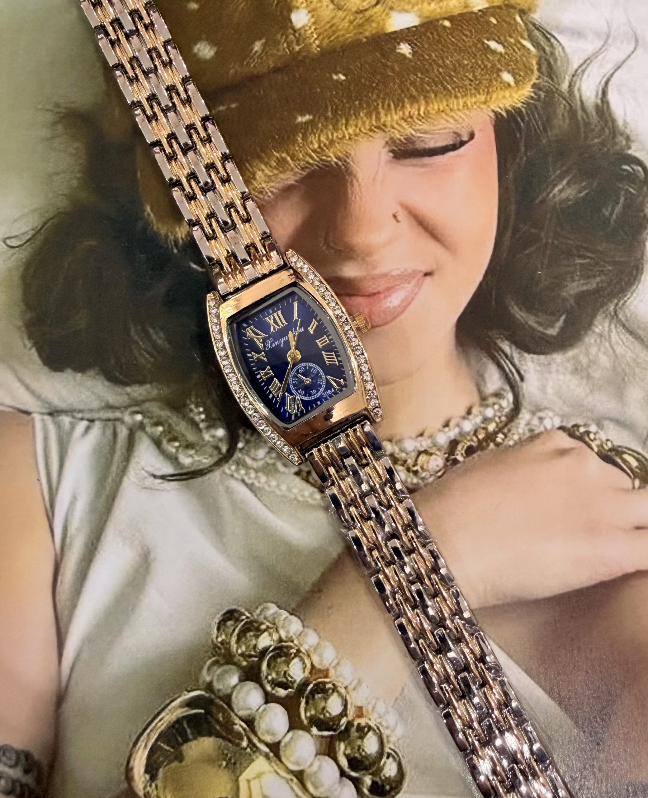 Εντυπωσιακό ρολόι που συνδυάζει τη διαχρονική κομψότητα με τη σύγχρονη λάμψη. Το βαθύ μπλε καντράν αναδεικνύεται από πολυτελείς χρυσές λεπτομέρειες και λαμπερά στρας, προσθέτοντας μία αίσθηση πολυτέλειας σε κάθε εμφάνιση. Το δίχρωμο λουράκι σε χρυσό και ασημί τόνο ολοκληρώνει αρμονικά το σχέδιο, καθιστώντας το ιδανικό τόσο για καθημερινή χρήση όσο και για πιο επίσημες περιστάσεις.