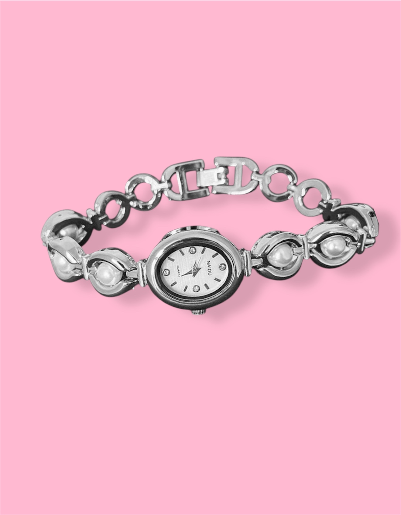 Κλασικό ρολόι-βραχιόλι με πέρλες, σε διακριτικό design που ταιριάζει υπέροχα και σε λεπτούς καρπούς!Διακριτικό αλλά εντυπωσιακό, τραβά την προσοχή με τη λάμψη και την αρμονία του.