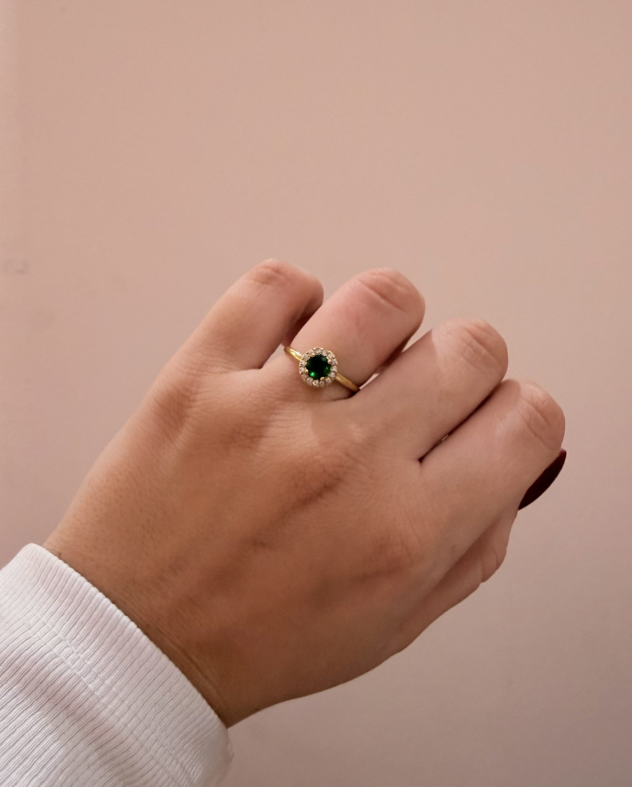 Ένα υπέροχο μονόπετρο δαχτυλίδι που αποπνέει ρομαντισμό και διακριτική πολυτέλεια. Στο κέντρο δεσπόζει μία λαμπερή πράσινο πέτρα, πλαισιωμένη περιμετρικά από μικρά στρας που ενισχύουν τη λάμψη και χαρίζουν εντυπωσιακό αποτέλεσμα.Είναι one size με πρακτική αυξομείωση στο πίσω μέρος, ώστε να προσαρμόζεται άνετα σε πιο μικρά αλλά και μεγαλύτερα μεγέθη δαχτύλων.