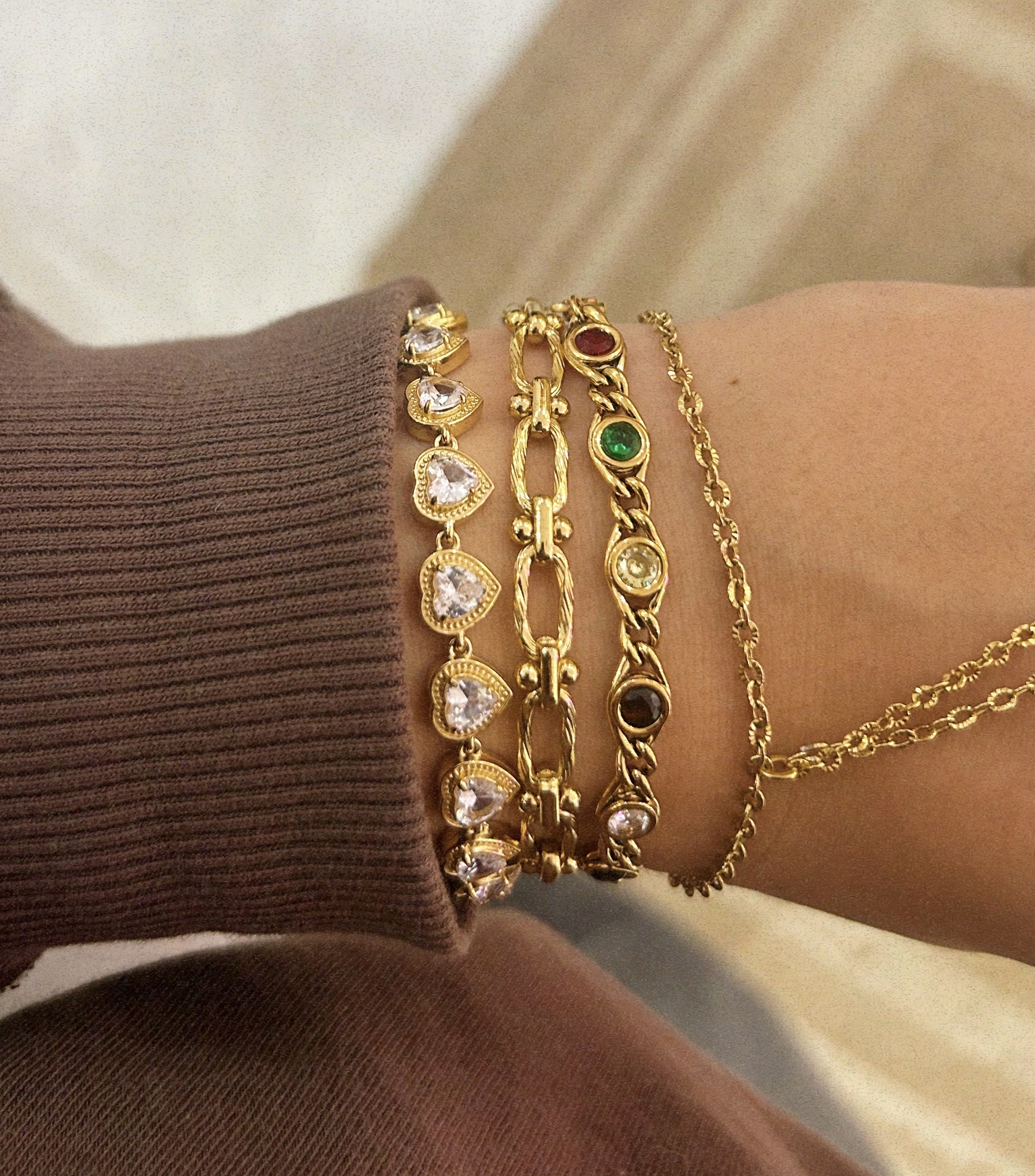 Κράμα χαλκού και ψευδαργύρου, με χρυσή όψη και εξαιρετική αντοχή. Είναι ιδανικό για statement κοσμήματα. Μπορεί να οξειδώνεται με τον καιρό, κάτι που μπορεί να προληφθεί με σωστή φροντίδα και αποθήκευση.