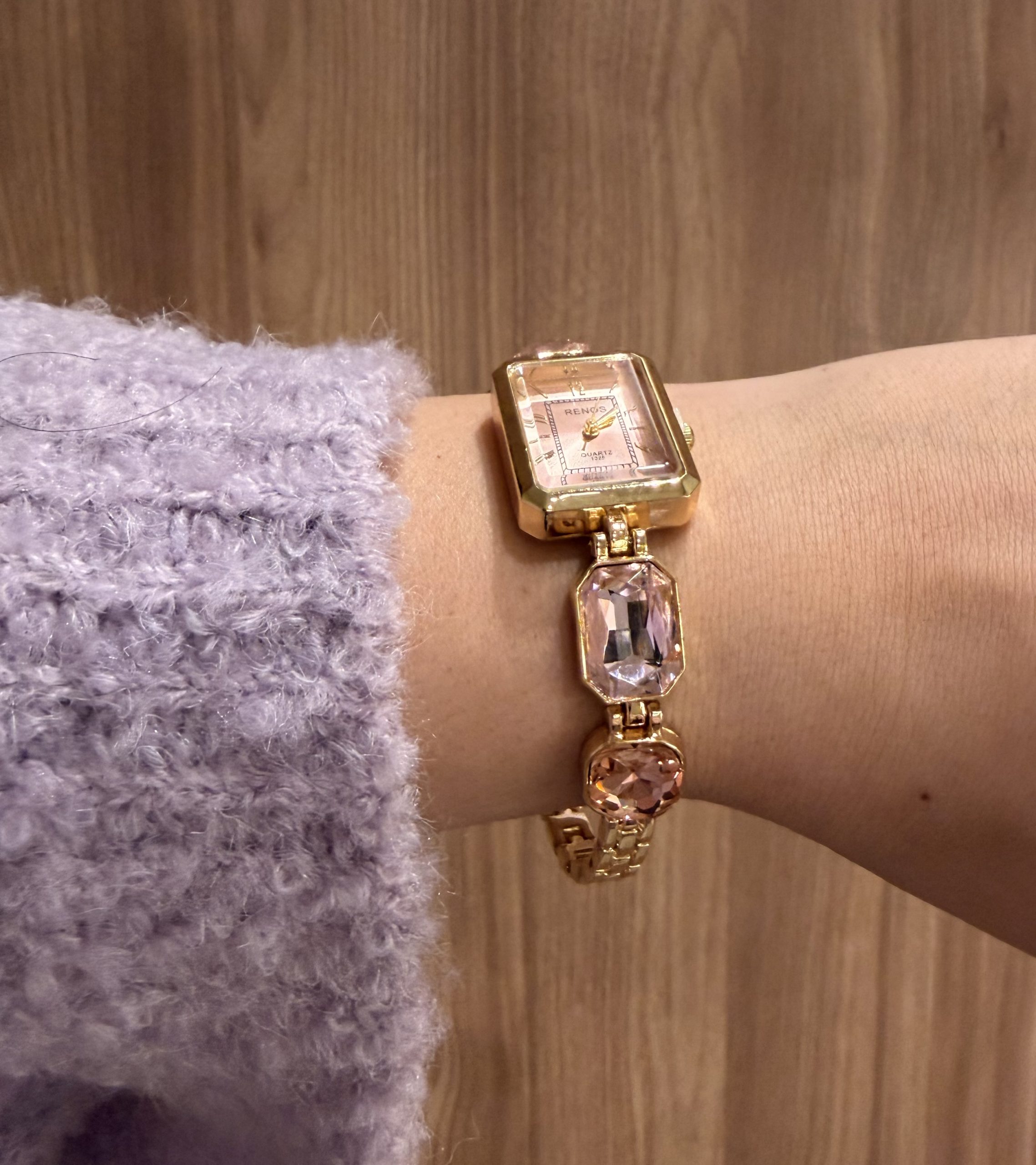 Ένα ρολόι σε κομψό vintage στυλ που αποπνέει ρομαντισμό και διαχρονική λάμψη. Το λουράκι του είναι διακοσμημένο με ροζ στρας σε όλο το μήκος προσθέτοντας μια εκλεπτυσμένη φωτεινή λεπτομέρεια. Η απαλή χρυσή γυαλιστερή απόχρωση του μεταλλικού μέρους συνδυάζεται αρμονικά δημιουργώντας ένα elegant κομμάτι που ξεχωρίζει σε κάθε εμφάνιση. Ιδανικό για όσες αγαπούν το vintage glam και θέλουν ένα ρολόι που λειτουργεί και ως κόσμημα