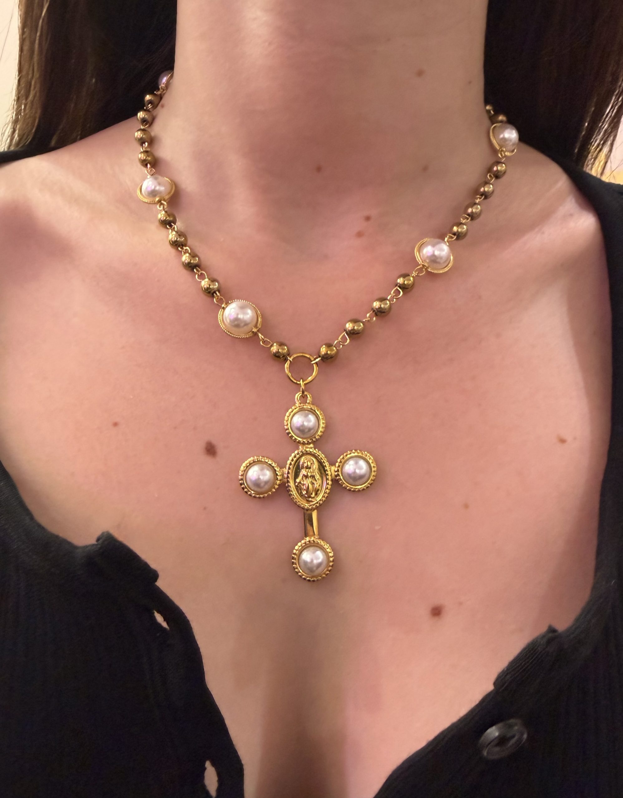 Εντυπωσιακό κολιέ με μοναδικό σχέδιο που ξεχωρίζει για τον αρκετά μεγάλο σταυρό στο κέντρο. Ο σταυρός είναι διακοσμημένος με Κωνσταντινάτο και κομψές πέρλες στις άκρες, προσδίδοντας διαχρονική και αρχοντική αισθητική.Η αλυσίδα διαθέτει στοιχεία πέρλας και διακριτικά κυκλάκια σε όλο το μήκος, δημιουργώντας ένα πλούσιο και καλαίσθητο αποτέλεσμα. Ένα κόσμημα που συνδυάζει παράδοση και σύγχρονη κομψότητα, ιδανικό για ιδιαίτερες εμφανίσεις αλλά και ως ξεχωριστό δώρο.