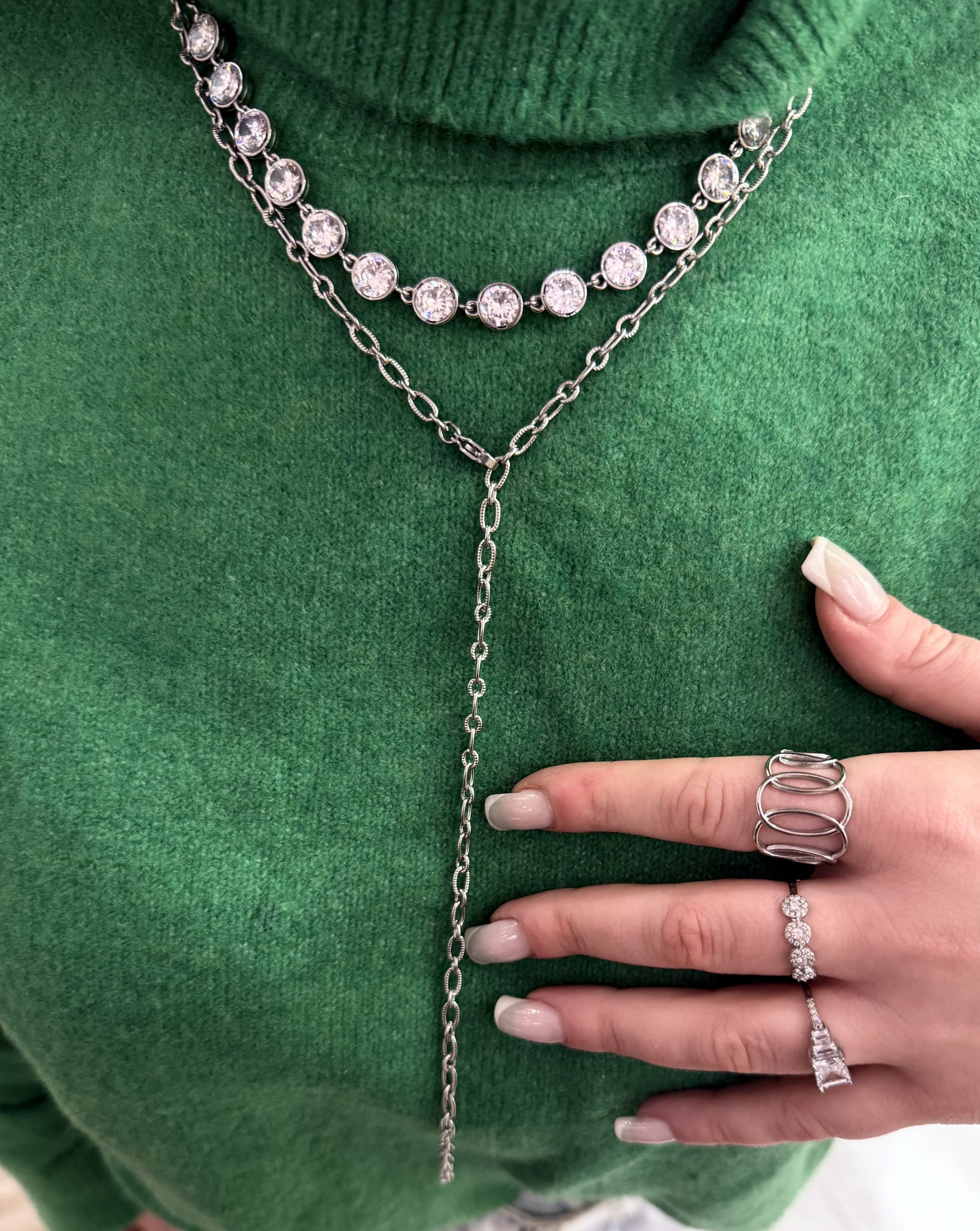Αυτό το λαμπερό κολιέ ριβιέρα είναι εμπνευσμένο από το κλασικό glamour και συνδυάζει την κομψότητα με μια μοντέρνα, εκλεπτυσμένη αισθητική.