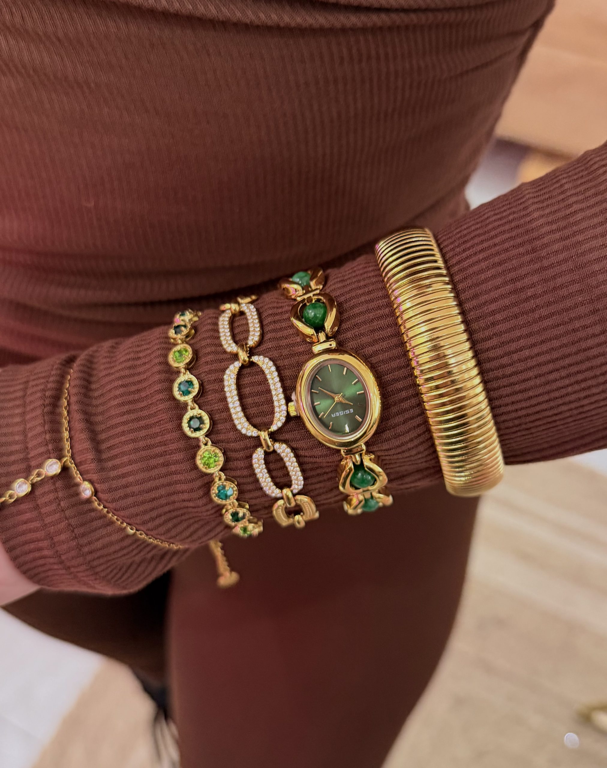 Κράμα χαλκού και ψευδαργύρου, με χρυσή όψη και εξαιρετική αντοχή. Είναι ιδανικό για statement κοσμήματα. Μπορεί να οξειδώνεται με τον καιρό, κάτι που μπορεί να προληφθεί με σωστή φροντίδα και αποθήκευση.