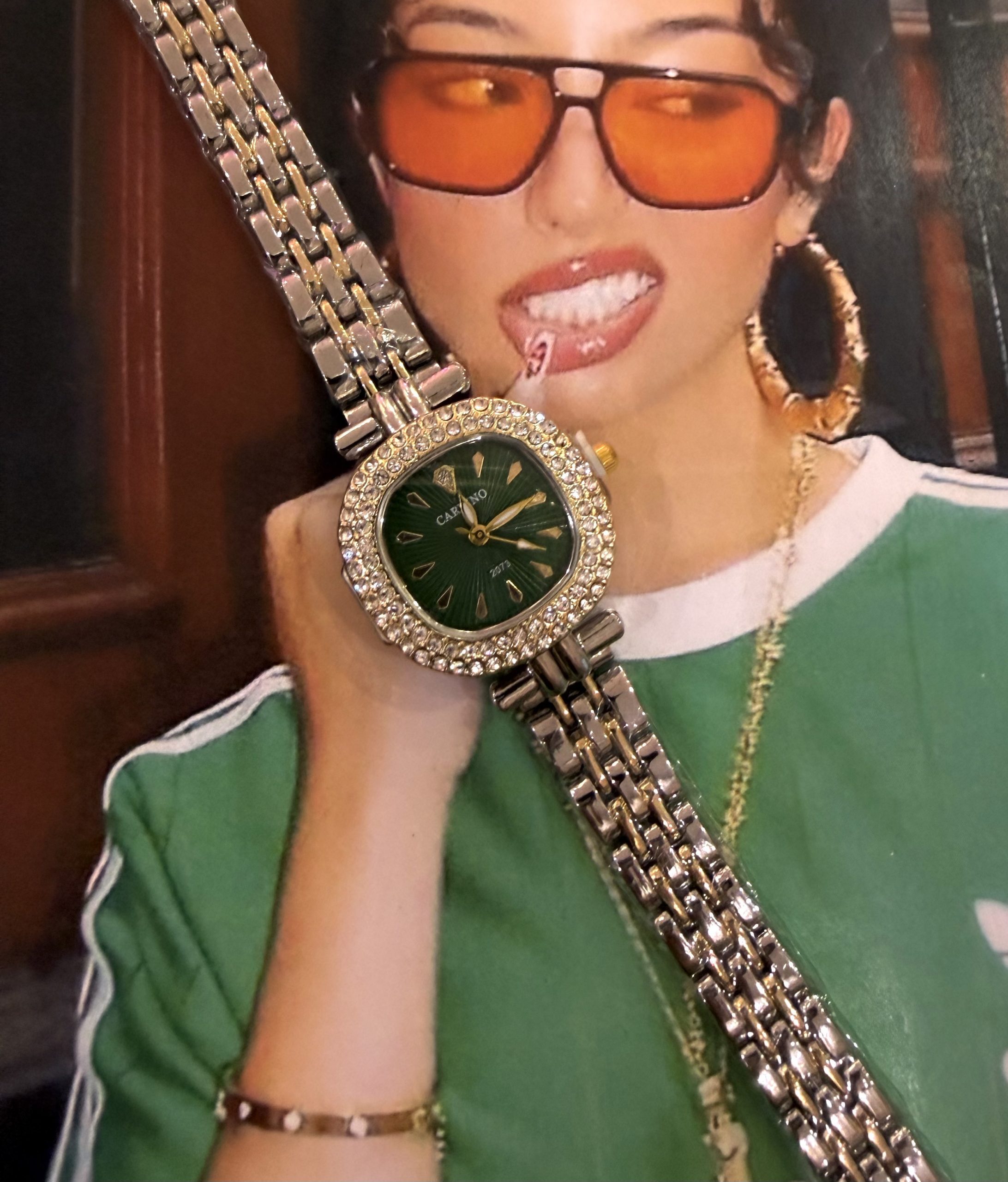Ρολόι σε vintage στυλ.Ένα κομψό δίχρωμο ρολόι σε χρυσές και ασημί αποχρώσεις, με green καντράν που ξεχωρίζει. Το καντράν διακοσμείται με δύο σειρές απο στρας, προσφέροντας λάμψη και πολυτέλεια. Το βραχιόλι του ρολογιού ακολουθεί τον ίδιο δίχρωμο συνδυασμό, δημιουργώντας ένα αρμονικό και εκλεπτυσμένο αποτέλεσμα.