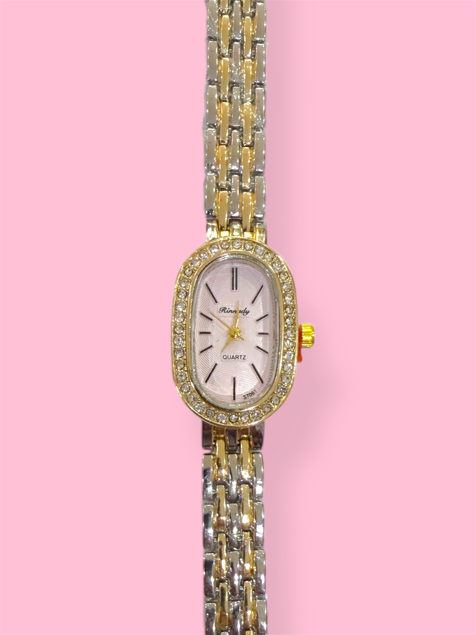 Κομψό ρολόι vintage αισθητικής, με οβαλ σχέδιο και διχρωμία χρυσού ασημι στο λουράκι, ιδανικό για λεπτούς καρπούς.