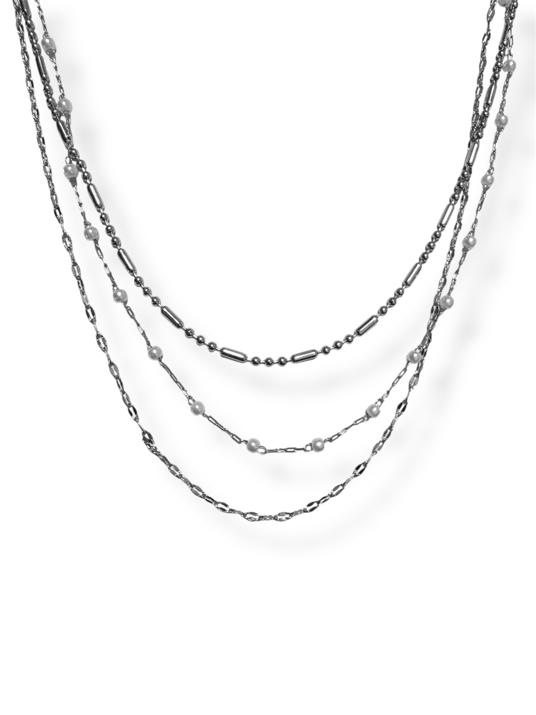 Δύο λεπτές ασημένιες αλυσίδες συναντούν μια λεπτή με μικρές λευκές πέρλες, δημιουργώντας ένα διακριτικά κομψό layered look. Κλείνει με ασφαλές κουμπόμα στο πίσω μέρος, ιδανικό για καθημερινές εμφανίσεις.