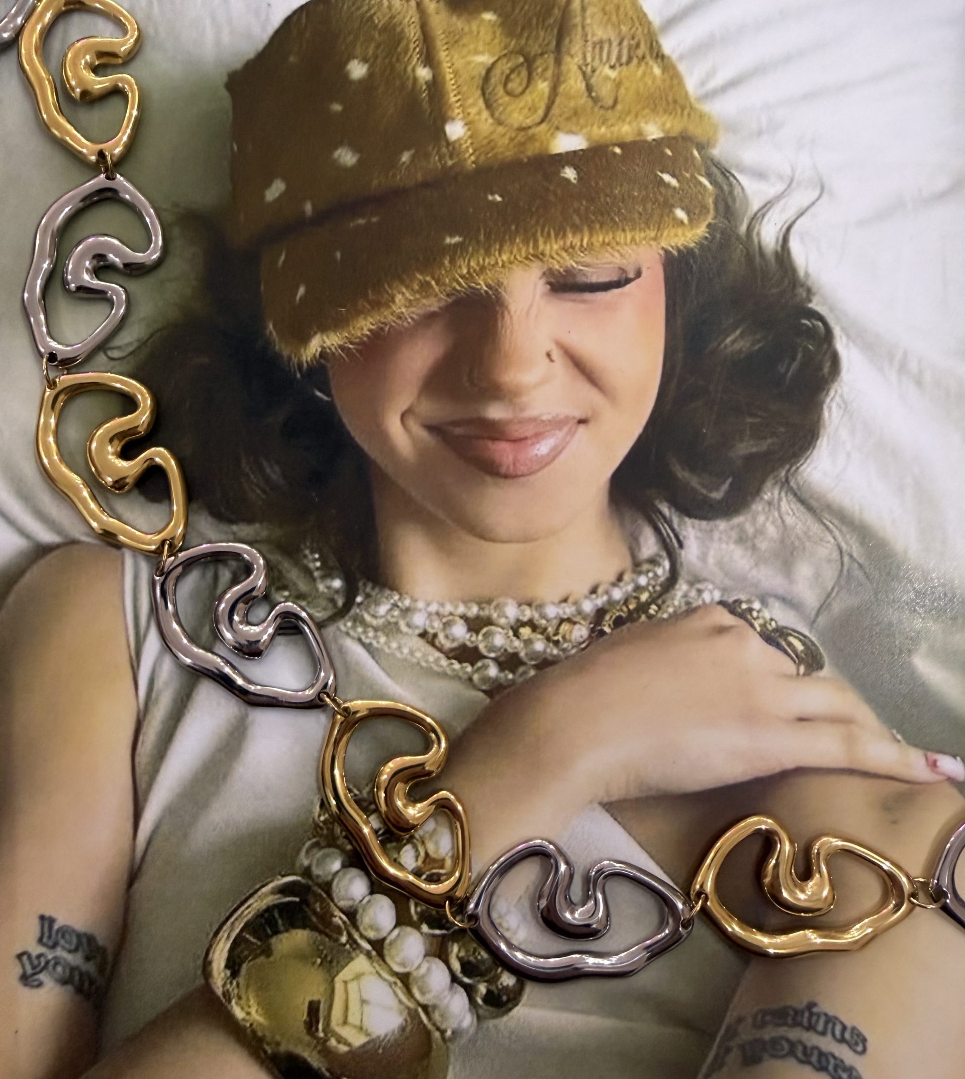 Κράμα χαλκού και ψευδαργύρου, με χρυσή όψη και εξαιρετική αντοχή. Είναι ιδανικό για statement κοσμήματα. Μπορεί να οξειδώνεται με τον καιρό, κάτι που μπορεί να προληφθεί με σωστή φροντίδα και αποθήκευση.