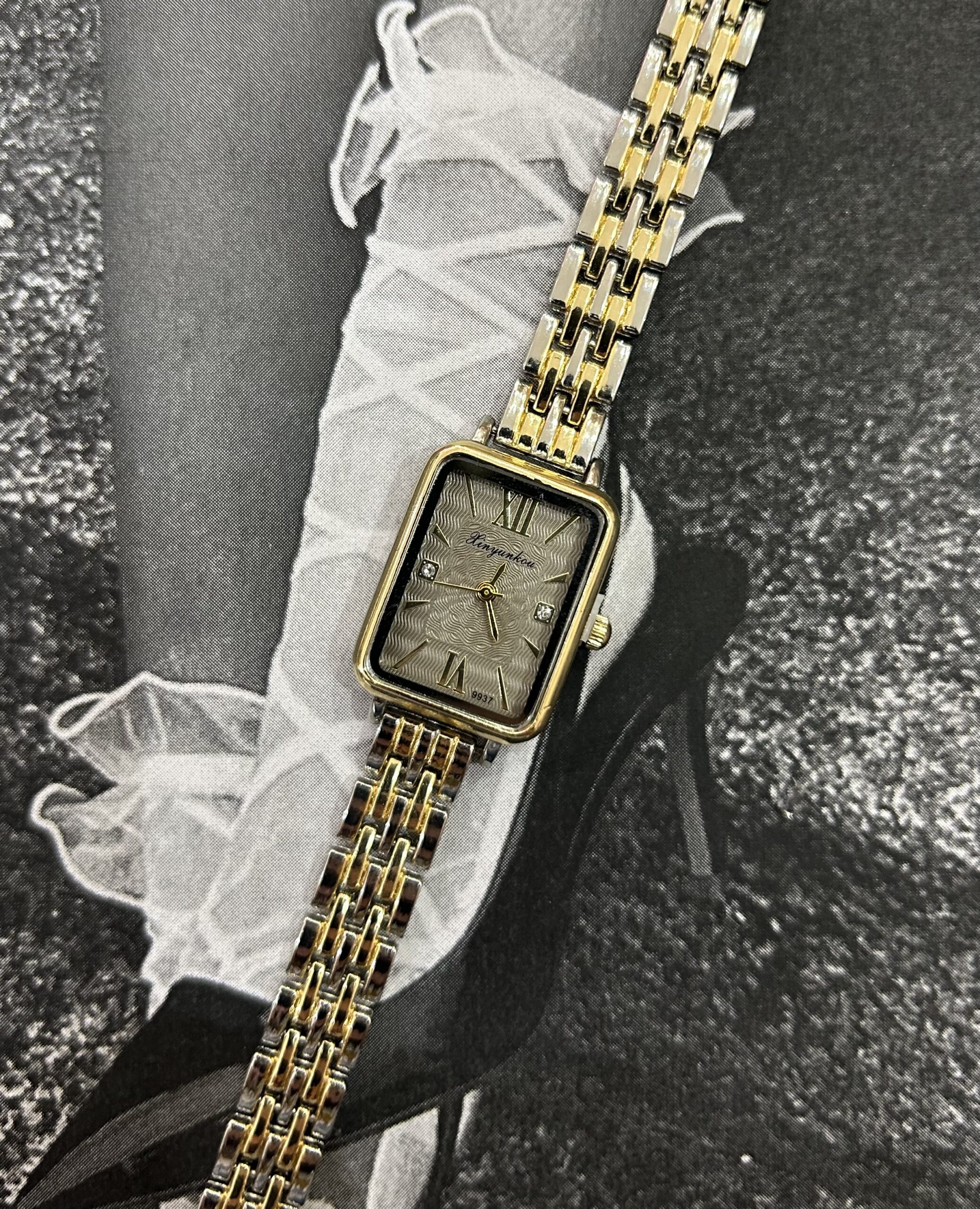 Κομψό ρολόι vintage αισθητικής, με τετράγωνο σχέδιο και διχρωμία χρυσού ασημι στο λουράκι, ιδανικό για λεπτούς καρπούς.