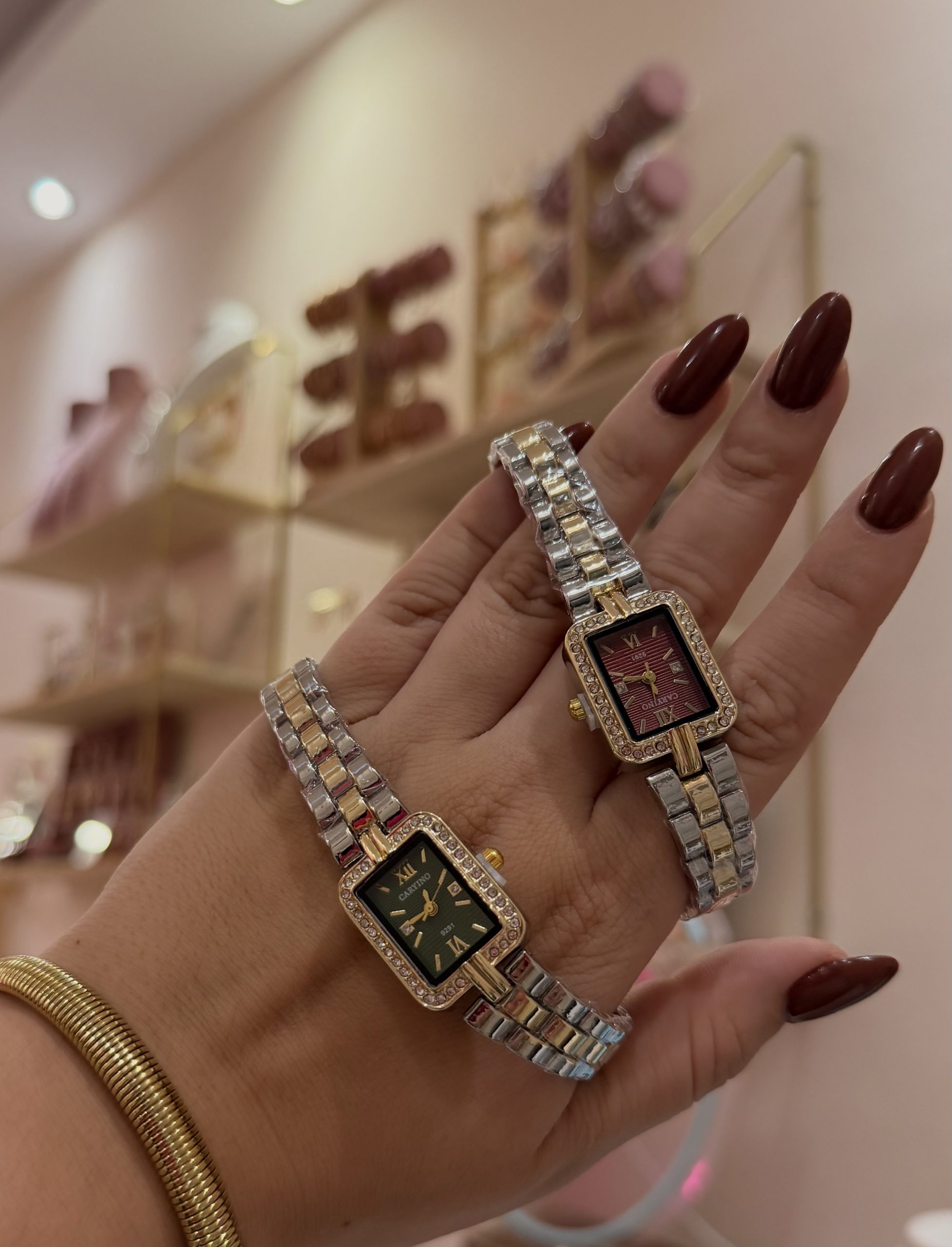 Κομψό ρολόι vintage αισθητικής, με τετράγωνο σχέδιο και διχρωμία χρυσού ασημι στο λουράκι, ιδανικό για λεπτούς καρπούς.