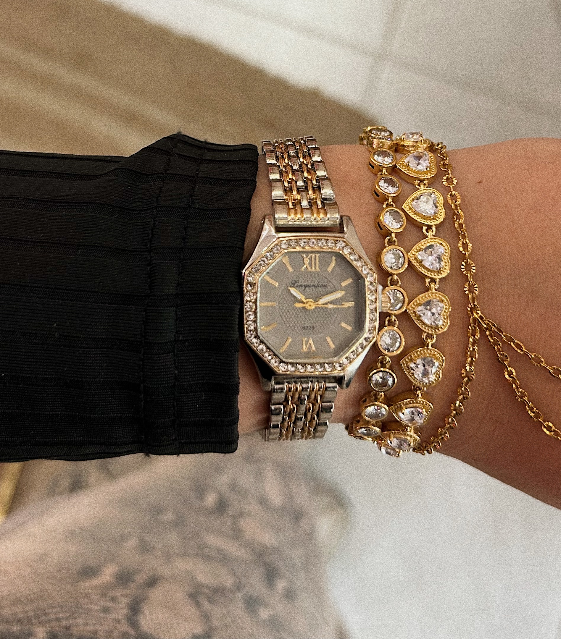 Ένα κομψό και εντυπωσιακό ρολόι με γκρι καντράν, διακοσμημένο περιμετρικά με λαμπερά στρασάκια που χαρίζουν λάμψη και πολυτέλεια σε κάθε εμφάνιση. Το λουράκι του συνδυάζει αρμονικά χρυσές και ασημί αποχρώσεις, δημιουργώντας ένα διαχρονικό αποτέλεσμα που ταιριάζει τόσο σε καθημερινές όσο και σε πιο επίσημες περιστάσεις.