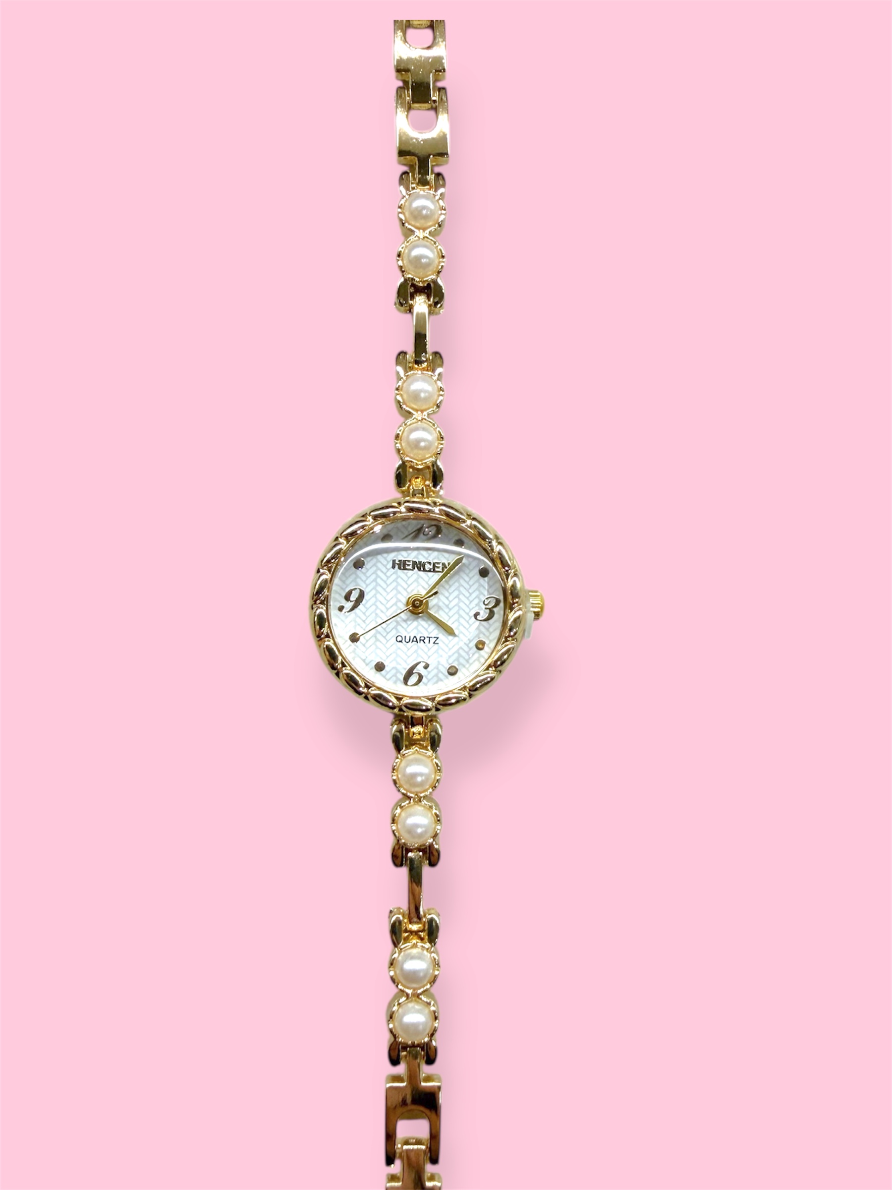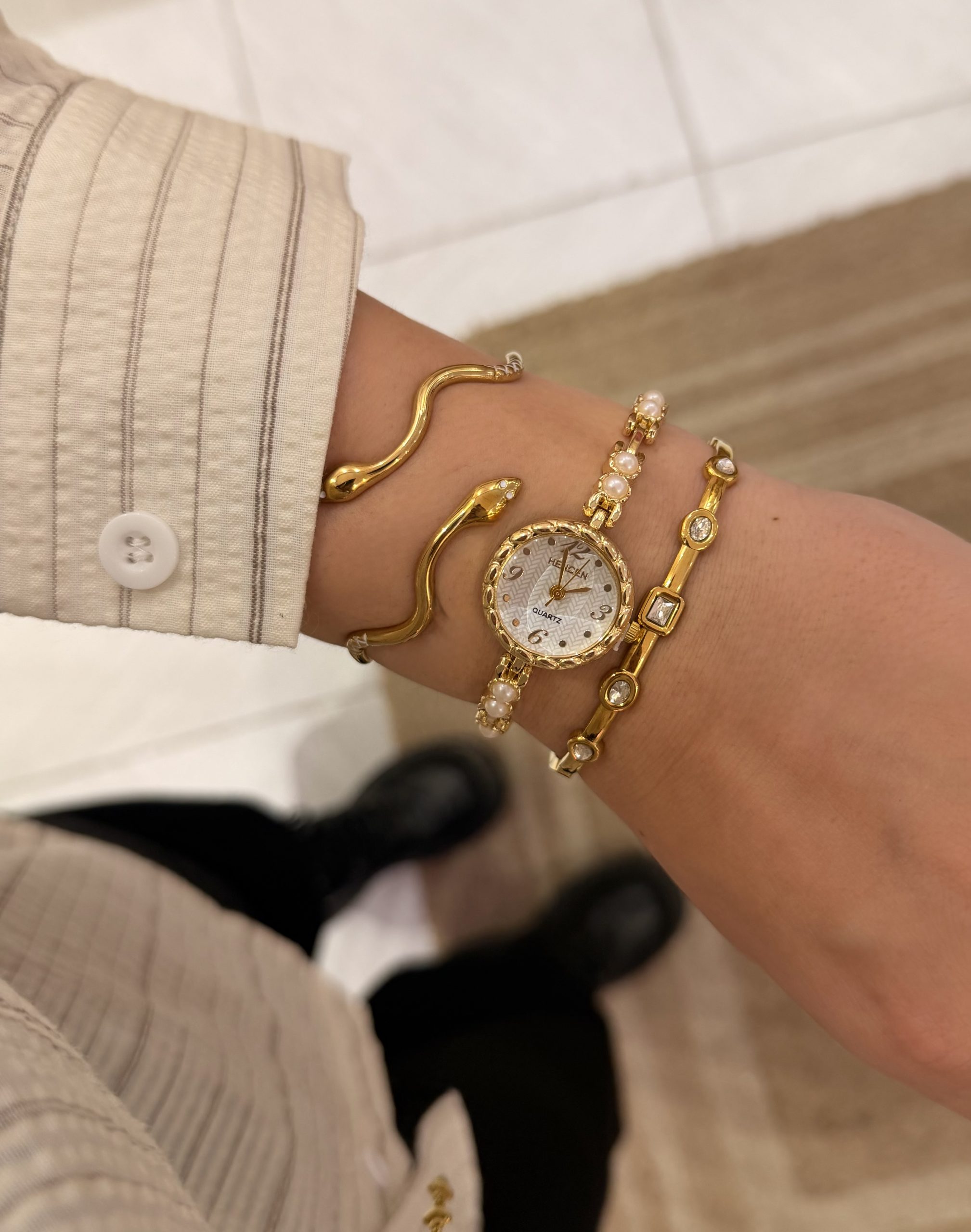 Αναδείξτε το στυλ σας με ένα φανταστικό, κομψό ρολόι σε χρυσή απόχρωση διακοσμημένο με λαμπερές πέρλες. Ο σχεδιασμός τύπου bracelet προσφέρει elegant και διακριτική πολυτέλεια, ενώ η κλασική του αισθητική το καθιστά ιδανικό για κάθε περίσταση από καθημερινές εμφανίσεις έως βραδινές εξόδους.