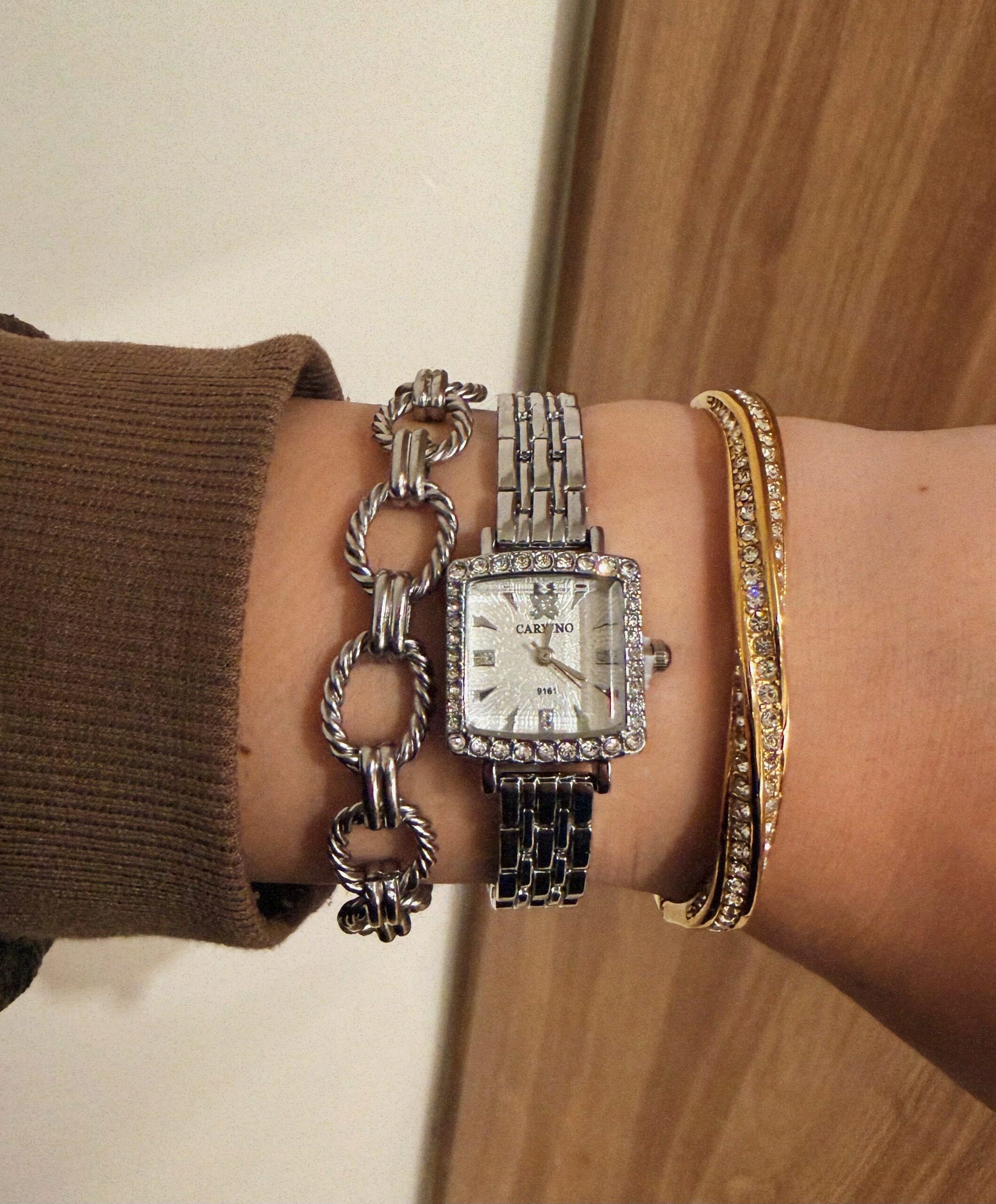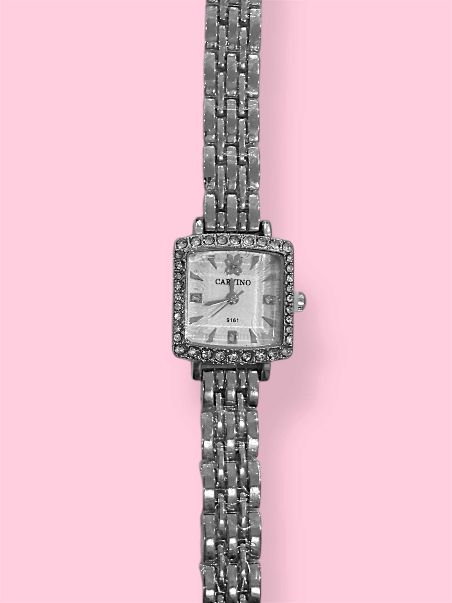 Ένα κομψό ρολόι με άσπρο καντράν , που κλέβει τις εντυπώσεις με τη θηλυκή του αύρα. Το καντράν περιμετρικά είναι στολισμένο με λαμπερά στρασάκια, προσθέτοντας γκλάμουρ και λάμψη σε κάθε κίνηση. Το λουράκι του, σε ασημί απόχρωση με ιδιαίτερο σχέδιο.