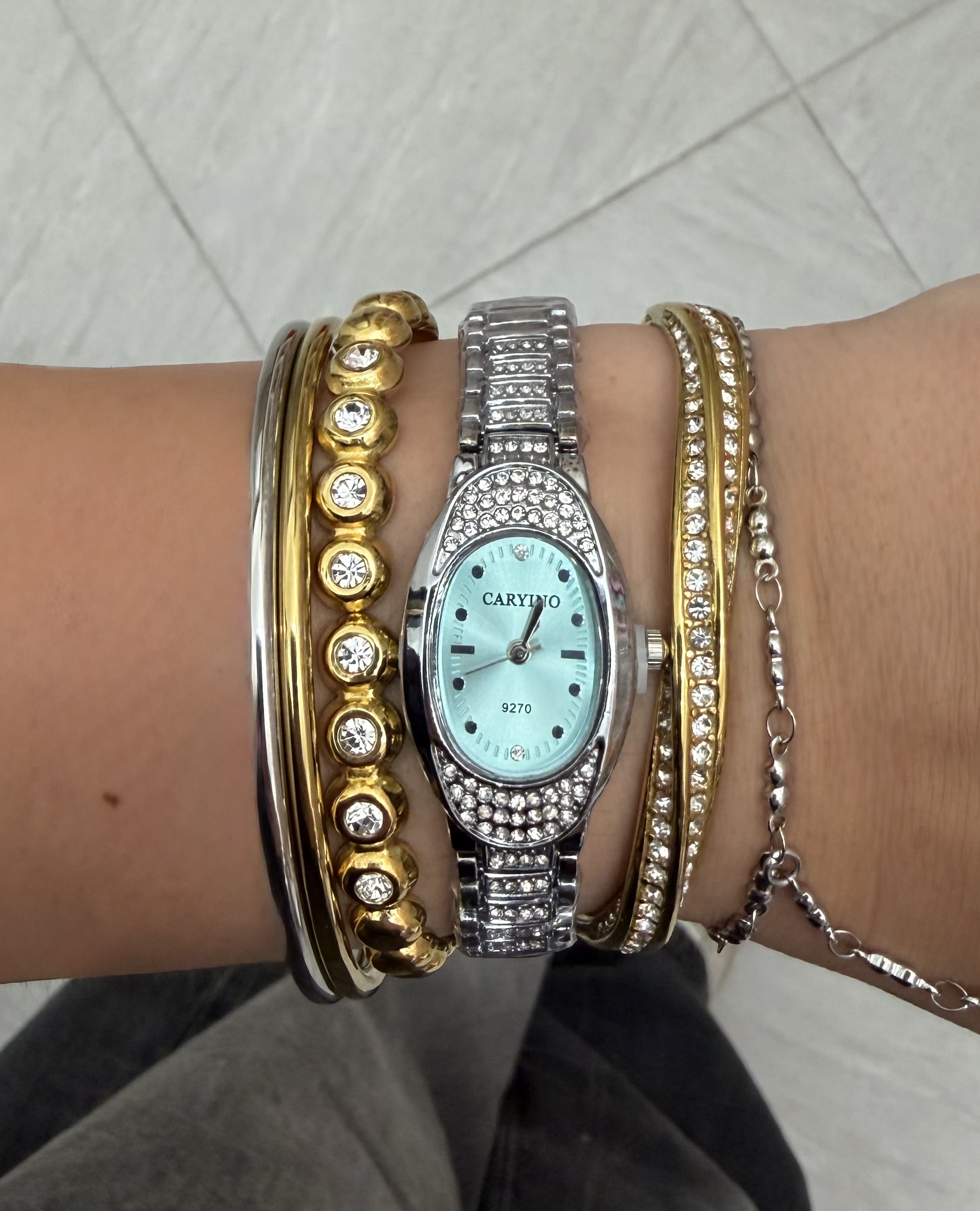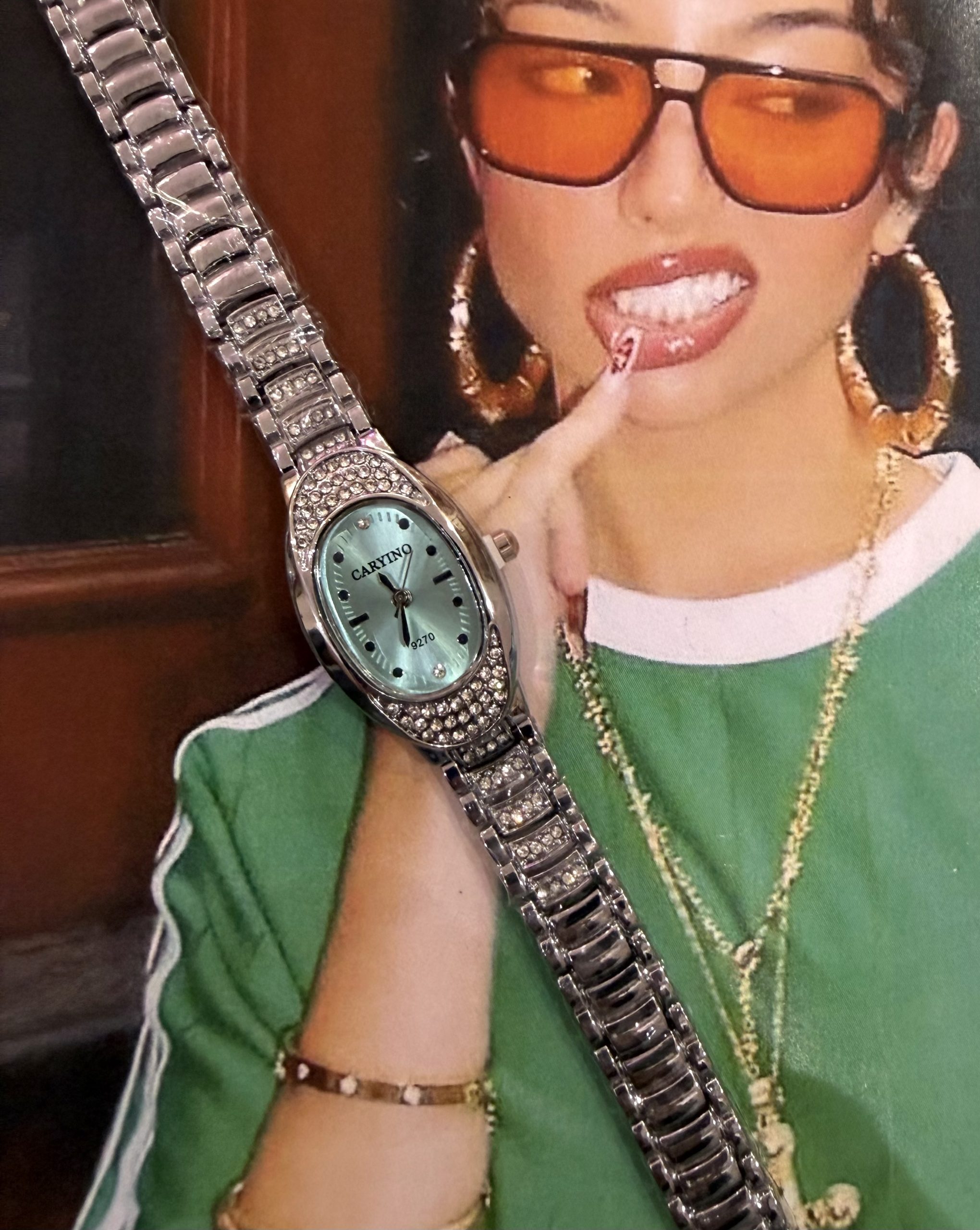 Ένα κομψό ρολόι σε οβάλ σχήμα με εντυπωσιακό θαλασσί καντράν που μαγνητίζει τα βλέμματα. Το πλαίσιο του καντράν είναι διακοσμημένο με λαμπερά στρασάκια, προσδίδοντας πολυτέλεια και λάμψη σε κάθε εμφάνιση. Ένα ιδιαίτερο αξεσουάρ που αποπνέει κομψότητα και στυλ!