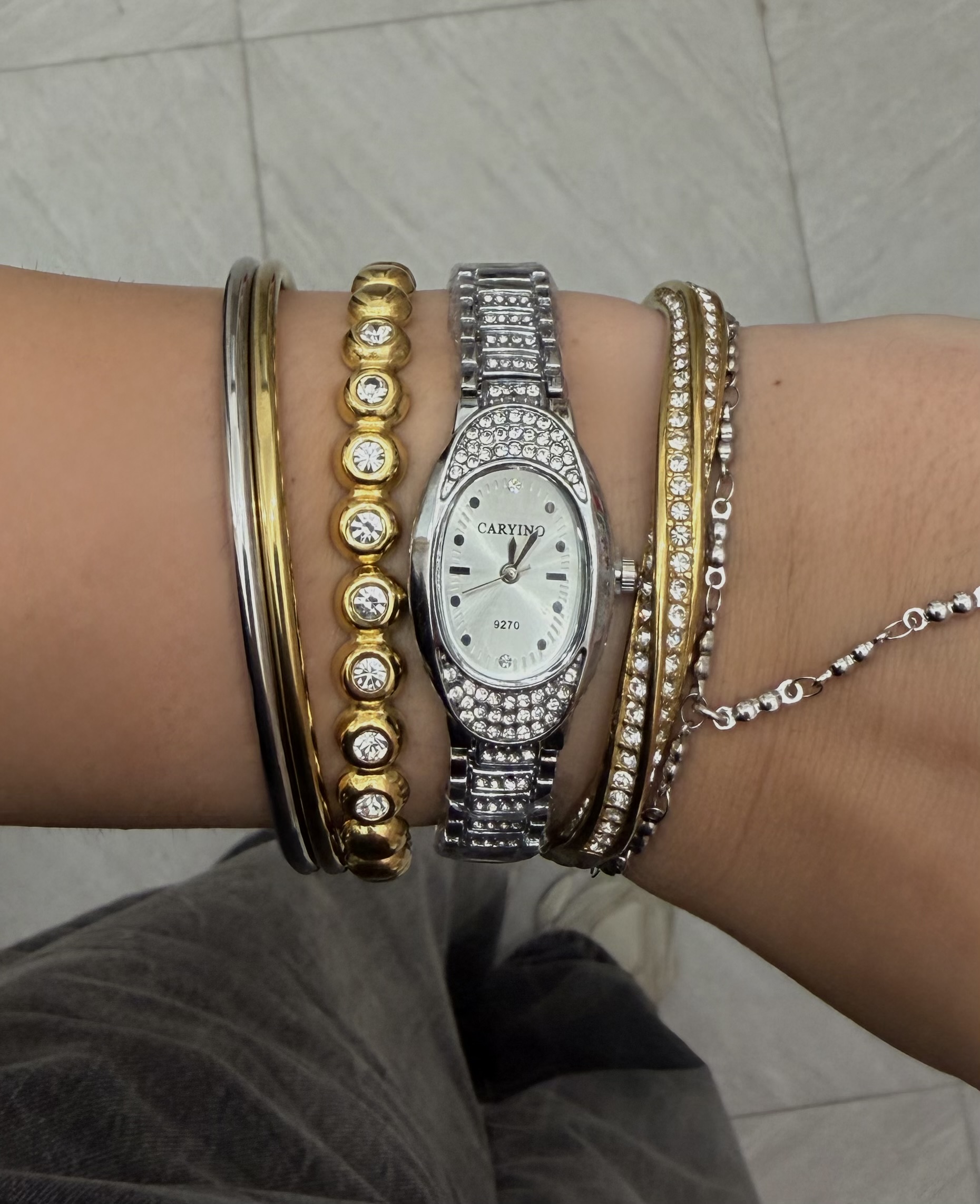 Ένα κομψό ρολόι σε οβάλ σχήμα με εντυπωσιακό ασπρο καντράν που μαγνητίζει τα βλέμματα. Το πλαίσιο του καντράν είναι διακοσμημένο με λαμπερά στρασάκια, προσδίδοντας πολυτέλεια και λάμψη σε κάθε εμφάνιση. Ένα ιδιαίτερο αξεσουάρ που αποπνέει κομψότητα και στυλ!