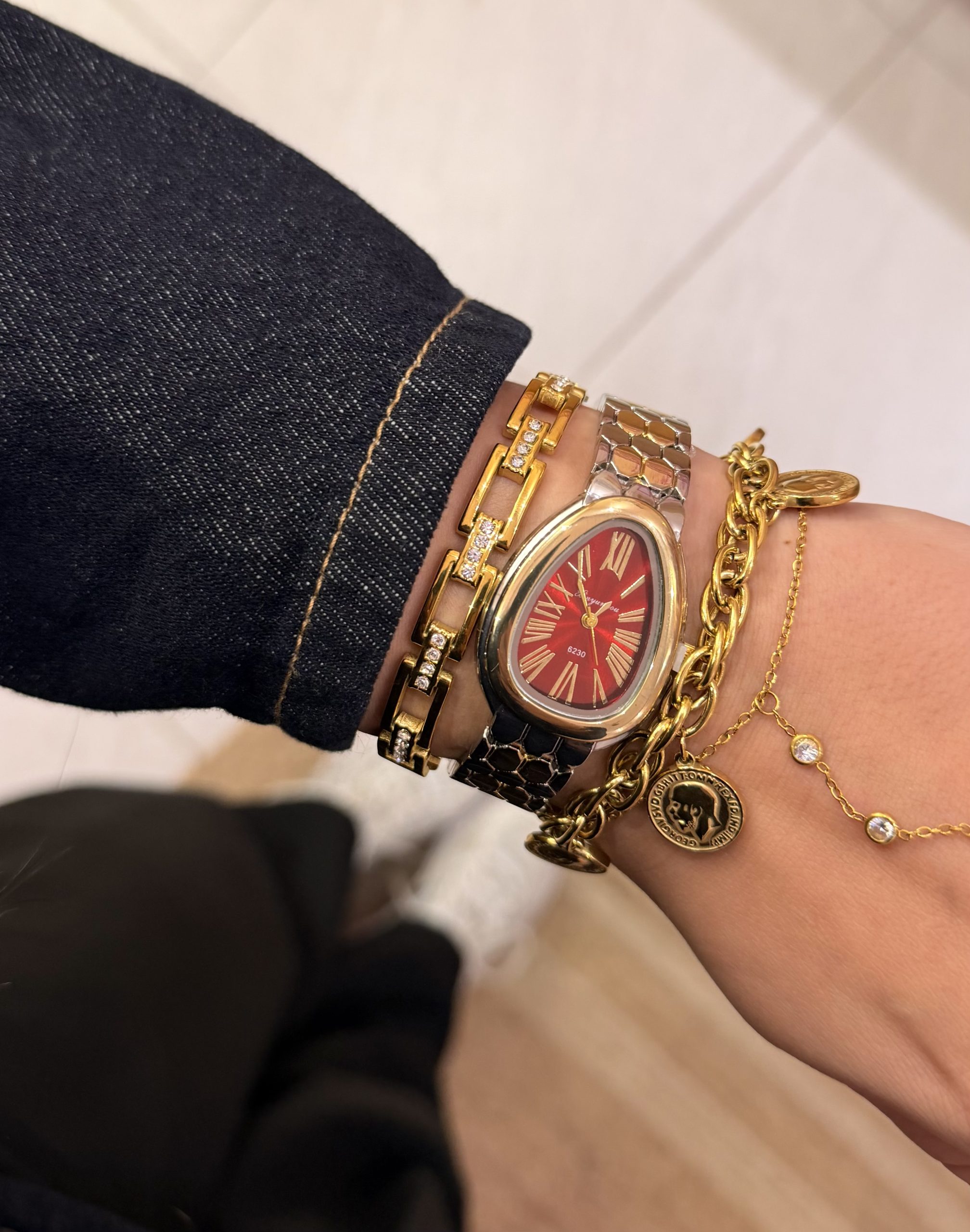 Κράμα χαλκού και ψευδαργύρου, με χρυσή όψη και εξαιρετική αντοχή. Είναι ιδανικό για statement κοσμήματα. Μπορεί να οξειδώνεται με τον καιρό, κάτι που μπορεί να προληφθεί με σωστή φροντίδα και αποθήκευση.