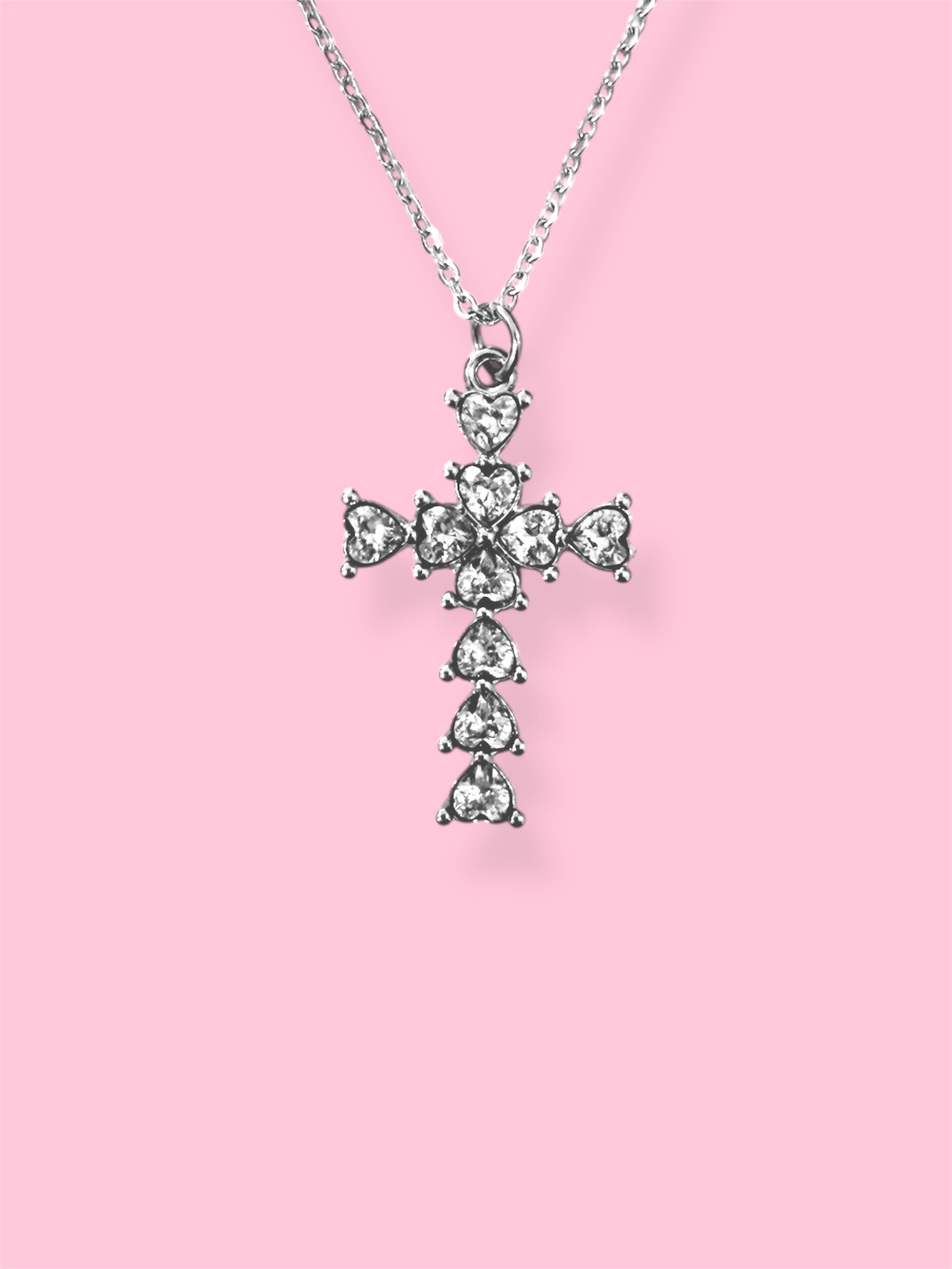 Ρομαντικό και κομψό κολιέ με λεπτό αλυσιδάκι και ιδιαίτερο σταυρό . Το σχήμα του σταυρού σχηματίζεται εξολοκλήρου από μικρές καρδιές σε όλο το μήκος, δημιουργώντας ένα μοναδικό σχέδιο που συνδυάζει τον συμβολισμό του σταυρού με τη γλυκύτητα της καρδιάς.