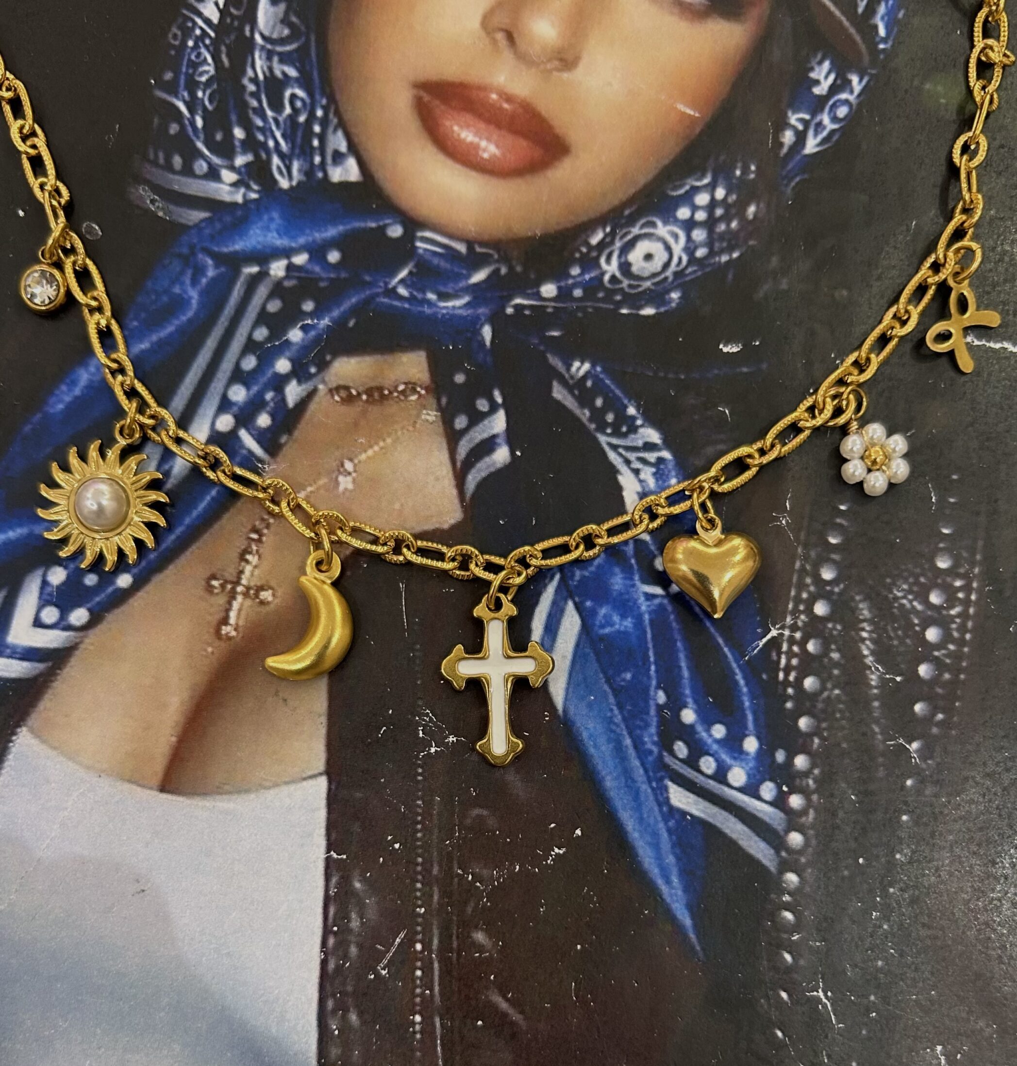 Ένα κομψό και διαχρονικό κόσμημα που συνδυάζει την πολυτέλεια του χρυσού με τη διακριτική λάμψη του λευκού. Το κολιέ είναι διακοσμημένο με λαμπερές πέρλες και μοναδικά charms σε χρυσό και λευκό, με κεντρικό στοιχείο έναν σταυρό με λευκό σμάλτο.Ιδανικό για κάθε περίσταση από καθημερινές εμφανίσεις μέχρι ιδιαίτερες στιγμές το κολιέ αυτό προσδίδει θηλυκότητα και στυλ, ενώ αποτελεί και μια υπέροχη επιλογή για δώρο.