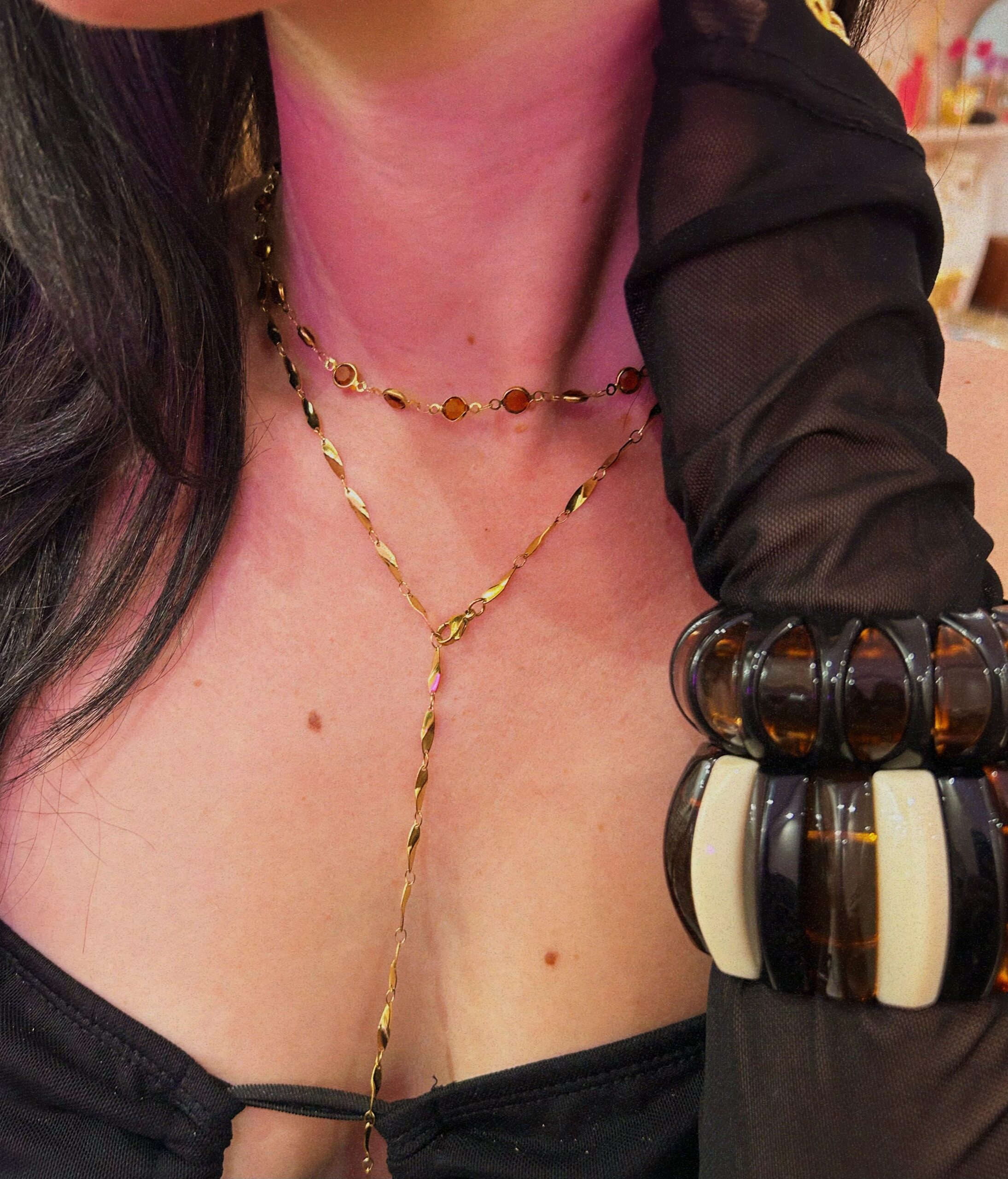 Αναδείξτε το στυλ σας με αυτό το κομψό χρυσόκολλε, διακοσμημένο με διακριτικά καφέ στρασάκια που προσθέτουν λάμψη σε κάθε κίνηση. Ιδανικό για να φορεθεί ως τσόκερ, ταιριάζει τέλεια με casual αλλά και πιο αυθόρμητα, δημιουργικά outfits, προσθέτοντας μια νότα κομψότητας και παιχνιδιάρικης διάθεσης.
